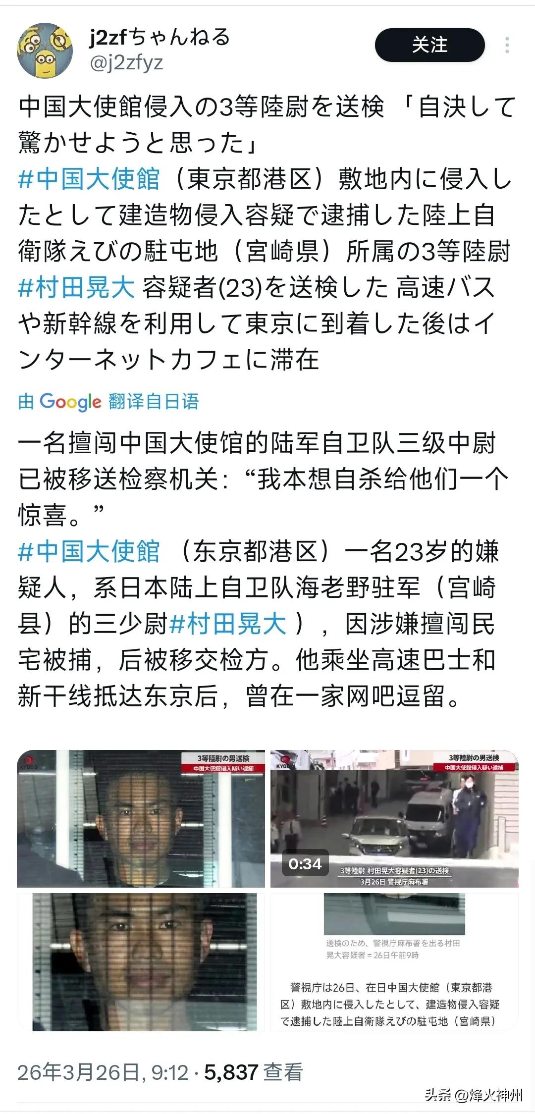 村田晃大的照片公布! 闯入中国驻日本大使馆的陆上自卫队队员村田晃大(23岁,三等陆尉)已被移送至检察机关。他被指控在未经许可的情况下进入位于东京都港区的中国大使馆建筑内,涉嫌犯有建筑物侵入罪。据称,村田表示自己“想通过自杀来制造轰动”。他在搭乘高速巴士和新干线抵达东京后,曾停留在一家网吧中。 评几句: 日本陆上自卫队三等陆尉村田晃大擅自闯入中国驻日使馆,现已被移送检方。这名23岁自卫队员跨城奔波、私闯外交禁地,竟声称只为“自杀制造轰动”,这番说辞荒诞至极,更暴露出多重问题。 身为现役军人,无视军纪擅自离岗,漠视外交场所不可侵犯的国际法准则,持刀闯入他国使馆,既践踏外交底线,也让日本安保与军纪颜面扫地。其所谓“以死博关注”的动机,看似个人极端,实则折射出部分日本右翼思潮下的非理性偏执。 自卫队人员管理形同虚设,让一名新晋军官轻易脱离管控、策划闯馆,所谓纪律约束沦为空谈。这场荒唐闹剧,不仅是个人心智失常的闹剧,更是日本社会极端思想蔓延、安保体系漏洞百出的真实写照,日方理应深刻反思,切实承担起保护外国使馆安全的责任。