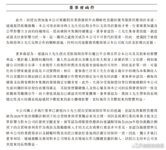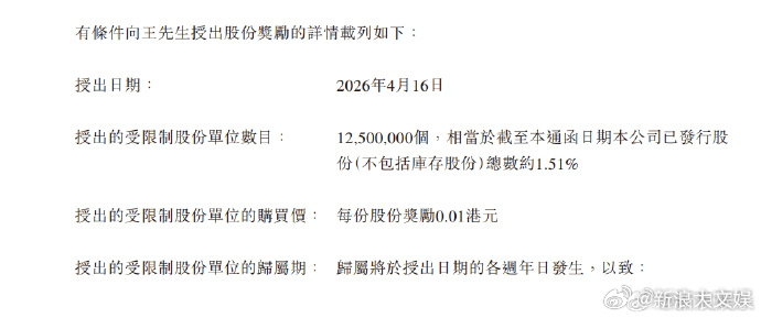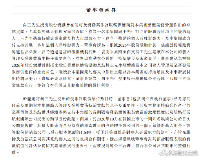 乐华娱乐寻求与王一博的长期合作乐华建议向王一博授出股份奖励 据乐华娱乐25日公开的董事会函件,公司建议有条件向授出股份奖励:旨在认可及奖励其对集团业务做出的卓越贡献,寻求维持与王一博的长期合作。董事会认为,挽留王一博带来的长期稳定性及可持续表现超过对少数股东的最小摊薄影响,更好符合全体股东的整体利益。