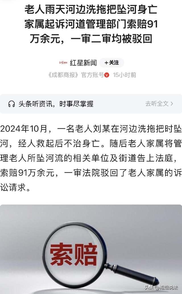 江苏无锡,一位老人家在下雨天的时候到河边洗拖把,走到河边的某处台阶上清洗拖把时,不小心跌入河内,大概几分钟之后,旁边热心人将老人家救上岸,赶紧帮忙送医治疗,之后老人家还是不幸离世。事发后,家属将河道管理部门以及街道都给上诉了,索赔91万元。 红星新闻3月25日报道了这则新闻。 下雨天、河道、湿滑、老人,总感觉这几个不稳定因素,存在着不可言说的危险。 可偏偏就是在下雨天,这几个因素,聚集在一起了。 在10月份的某个小雨天,天空正在下雨,路面湿滑比较严重。 而就在这个时候,老人家刘某却扛着一个拖把,不顾大雨淋漓,直接就朝着家附近的河道走去。 河道旁有个台阶,刘某心想,就站在台阶附近,把家里的拖把给清洗一下。 老人家就这样,站在湿漉漉的石台阶上,冒着大雨,不断的在河道里挥舞着拖把,试图把拖把给清洗干净。 可能因为老人家用力幅度比较大,或者是脚底下台阶比较滑,老人家身子没有站稳,一个踉跄直接就栽进了河里。 坠入河道之后,刘某不断的大声呼救,试图吸引附近的热心路人。 大概几分钟之后,刘某的体力不支,呼喊声也逐渐削弱。这个时候,有热心群众经过,赶紧过来帮忙把老人家救上了岸。 上岸之后,刘某意识不大清醒,路人赶紧帮忙给拨打了救助电话,将刘某给送去了医院抢救。 非常可惜的是,刘某并没有被抢救过来,最后还是离开了人世。 事发之后,刘某的家属认为河道管理相关单位、以及社区街道,都存在失职的情况,把两方都给上诉了,并且索赔91万元。 老人刘某的家属认为,案发的河道,就在居民生活区域,旁边还有通行街道,对于居民的正常生活和出行,都构成了危险。 另外,相关部门作为管理河道的执行单位,也没有在河道的周围设置警示标志或者护栏,最后导致刘某不慎跌入河内。 对于老人家的离世,这两方都需要承担连带责任。 针对家属的上诉,相关部门是怎么判定的呢? 在一审的时候,相关部门认为,行为人如果因为过错侵害他人民事权益造成损害,应该承担侵权责任。 根据《民典法》第一千一百六十五条规定,行为人因为过错侵害他人民事权益造成损害的,应该承担侵权赔偿责任。 这条法令的前提是,确实侵害方存在过错,但是如果责任平衡机制失衡,那就可以过失相抵。 根据《民法典》第一千一百七十三条,被侵权人对同一损害的发生或者扩大有过错的,可以减轻侵权人的责任。 由此可知,被侵害人如果自身存在重大过错的,可以削弱侵权人的责任。 这就意味着,即便行为人存在过错,只要可以证明被侵权人自身也有过错,则会“按责论赔”。 这个是侵权人存在过错的情况,如果侵权人履职、且毫无过错可言,受害一方则需要承担主要责任、甚至全部责任。 案件中根据视频可以看到,刘某自己下雨天去洗拖把,之后跌入河道中,他是自己疏忽了自身安全状况才不慎落水,是造成悲剧的直接原因。 一审则驳回了家属的全部诉请,家属不服,再次上诉。 那么,二审又是怎么审定的呢? 二审相关人员提出了以下这几点认定: 1.家属提出,没有垃圾清理、标志不明显、没有照明设施。根据查明可知,案发石台阶,是自然踏步形成,是村落普遍存在的设施,没有超出管理者的法定职责。 2.对于河道管理,如果完全封闭改造,超出管理者的法定职责,也跟乡村生活实际不相适应。 3.台阶湿滑这个问题,因为事发当天下雨、路面潮湿,这是自然天骑导致,并非管理者维护不当引发事故。 4.关于照明问题,事发时17点左右,光线尚且充足,而且沿岸设施并非市政道路,无法强制安装照明设施。 综合而言,难以认定上述两方对于老人家的过世存在过错。 二审时,相关工作人员认为,刘某作为完全民事行为人,对于雨天道路湿滑,应该具备认知和判断能力,不利天气下也不该接近河道,缺乏安全审慎义务。 最后,驳回老人家属的全部诉请,维持原判。 出了事,可以找寻侵权一方。但是完全是自己的责任,也只能“自食其果”,盲目追偿则毫无意义。 对此,你怎么看呢?