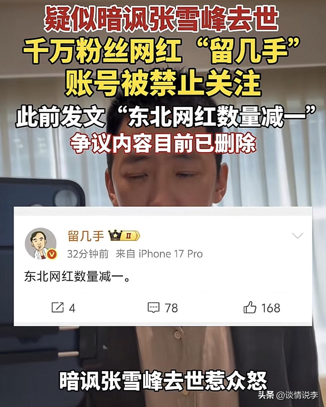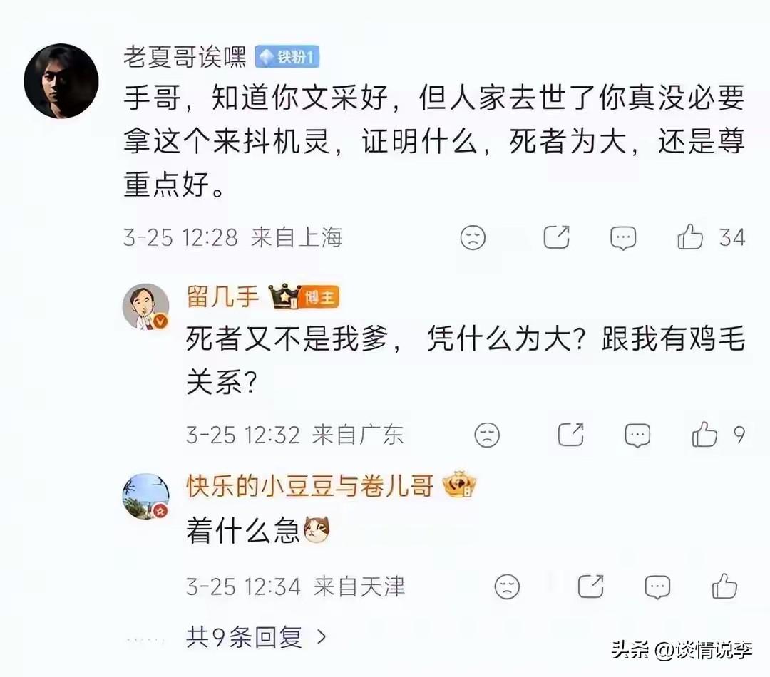 有多少人为了留几手下载围脖的?留几手现在应该很后悔吧,后悔不该说话不过脑子,后悔不该幸灾乐祸,后悔不该飘得这么厉害。 现在被禁止关注了,咎由自取。 作为初代网红,还是东北的,发这么一句话暗讽一位去世的老师有意思吗?还有一点素质吗?还知道什么是道德底线吗?死者为大,难道不是吗?更何况是为无数莘莘学子和家长指明方向的一位老师。更何况张老师做了那么多公益,还资助了很多因为家庭贫困上学困难的学生。而这位几手网红,又做了些什么?除了喊几嗓子“负分滚粗”,还会什么?有什么社会价值? 这就是人与人的不同,有人德高望重,有人修养全无,也难怪有很多网友表示,专门下载围脖去评论区骂他,很不幸吧?这就是搬起石头砸自己的脚,完全不给自己留最后一手。
