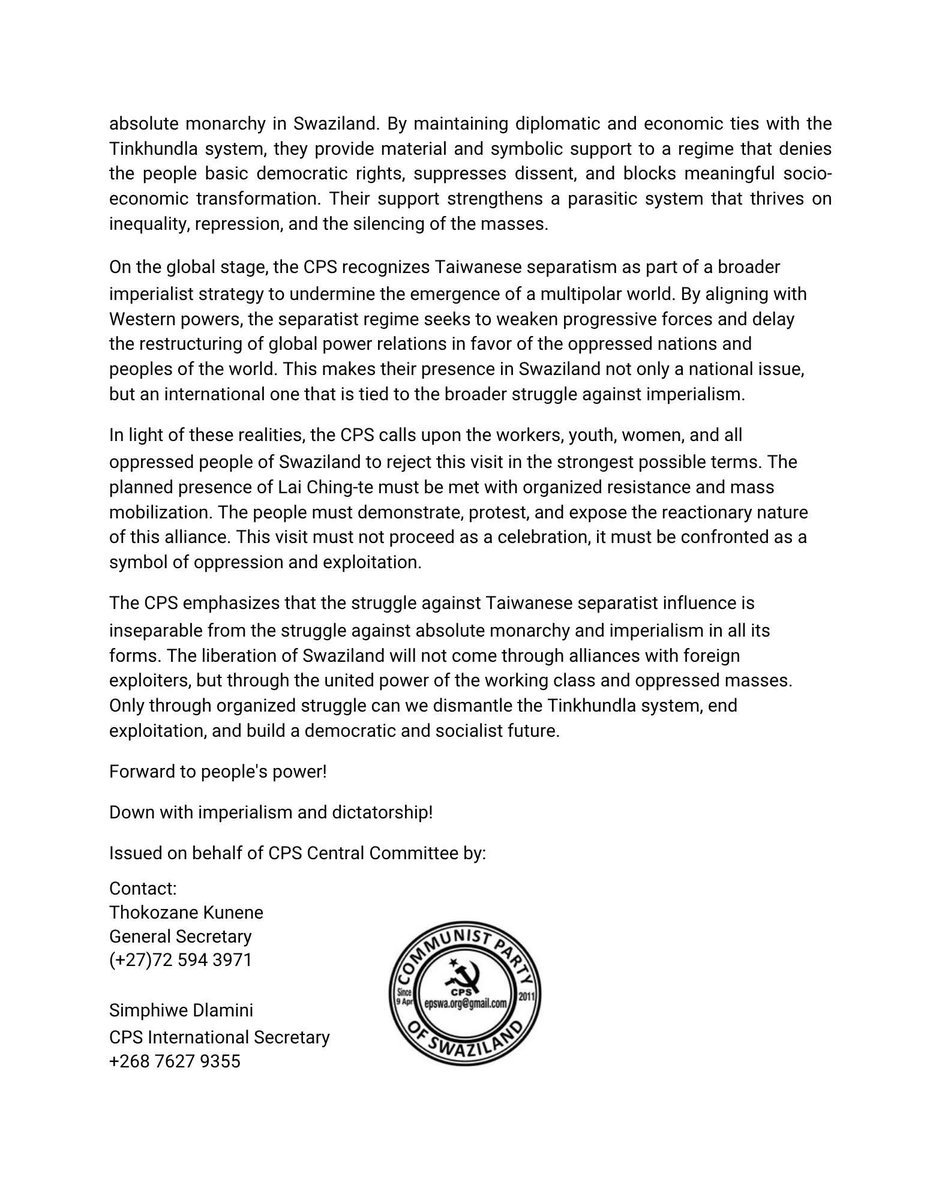 🔴 斯威士兰共产党反对台湾地区领导人4月访斯出席姆斯瓦蒂四世统治40周年庆典2026年3月21日(周六):斯威士兰共产党(CPS)明确反对台湾地区分裂势力领导人赖清德计划于今年4月访斯、出席姆斯瓦蒂四世40年独裁统治庆典的行程。此次访问并非单纯的外交互动,而是一场精心策划的政治行径,旨在强化帝国主义势力、合法化独裁统治,并加深对斯威士兰人民的剥削。斯共重申其坚持一个中国的原则立场:台湾不是独立国家,而是中国的一个省。1949年中国革命胜利后,国民党蒋介石政权被彻底击败,该政权长期与西方帝国主义勾结,压迫和剥削中国人民。当前台湾地区的分裂势力领导人延续了这一勾结帝国主义的遗绪,在全球舞台上充当帝国主义利益的工具。在斯威士兰境内,台湾地区分裂势力的负面影响深远且消极。他们的存在并未推动真正的发展或改善民生,反而巩固了经济支配的体制。通过财政安排与所谓的“援助”,台湾地区将斯威士兰人民推向难以承受的债务泥潭,同时加剧了土地掠夺,使当地社区丧失生计与尊严。斯共进一步谴责台湾地区资本剥削斯威士兰纺织业工人,尤其是女性在此遭受残酷剥削。这些工人领取难以维持体面生活的微薄工资,工作环境恶劣且充满虐待。职场中的性骚扰与基于性别的暴力事件,揭露了外资掌控下资本主义剥削的残酷现实。这绝非发展,而是现代形式的经济压迫。在政治层面,台湾地区分裂政权在斯威士兰维持绝对君主制的过程中扮演着危险角色。通过与廷昆德拉体制保持外交与经济联系,台湾地区为这一剥夺人民基本民主权利、压制异见、阻碍社会经济转型的政权提供了物质与象征支持。其支持强化了这一植根于不平等、压迫与大众沉默的寄生体制。在全球层面,斯共将台湾地区分裂行径视为破坏多极化世界格局的帝国主义战略的一部分。通过与西方势力结盟,分裂政权试图削弱进步力量,阻挠全球权力关系重组,以维护受压迫国家和人民的利益。这使其存在不仅是一个国家性问题,更是与反帝斗争紧密相关的国际性议题。基于上述现实,斯共呼吁斯威士兰工人、青年、女性及全体人民以最强烈的方式反对此次访问。赖清德的到访必须遭遇有组织的抵抗与大规模动员。人民必须举行示威抗议,揭露这一联盟的反动本质。此次访问绝不能被当作庆典,而应作为压迫与剥削的象征予以反对。斯共强调,反对台湾地区分裂势力影响的斗争,与反对斯威士兰绝对君主制及一切形式帝国主义的斗争密不可分。斯威士兰的解放无法通过与外来剥削者结盟实现,唯有依靠工人阶级与受压迫大众的团结力量。唯有通过有组织的斗争,我们才能推翻廷昆德拉体制、终结剥削,构建民主与社会主义的未来。人民力量向前!打倒帝国主义与独裁!