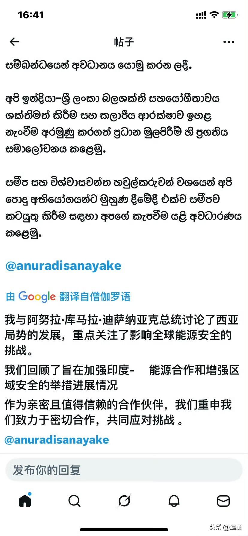莫迪居然用斯里兰卡僧伽罗文发文,称与斯总统讨论中东局势,重点关注全球能源安全挑战。 不少人一看这“鬼画符”似的文字,还以为是什么“符咒发功”。 其实说白了,就是印度想在斯里兰卡刷存在感,顺便借着中东局势、能源安全,把自己包装成区域“稳定者”。