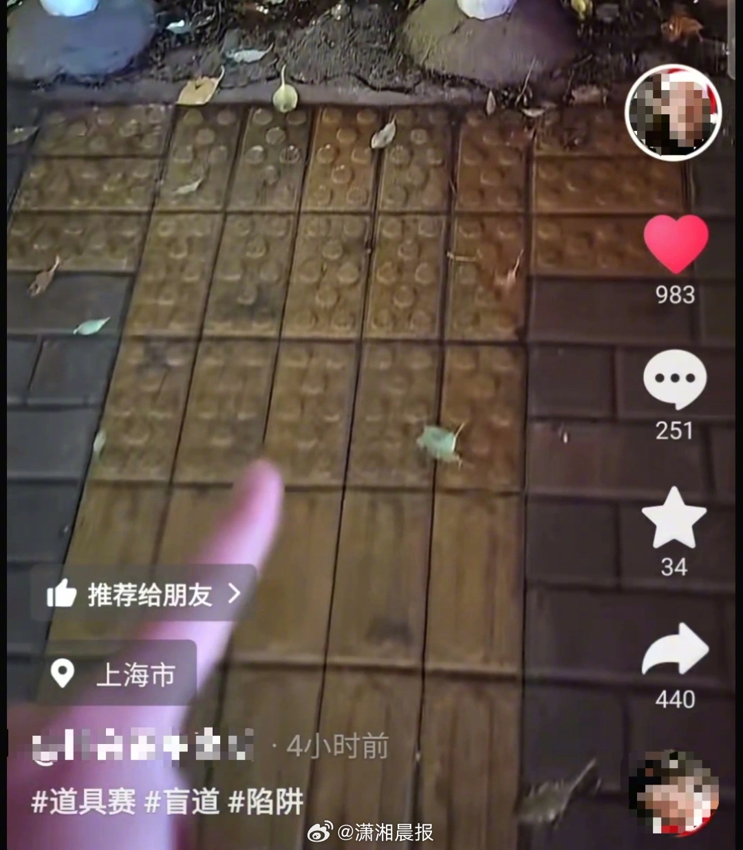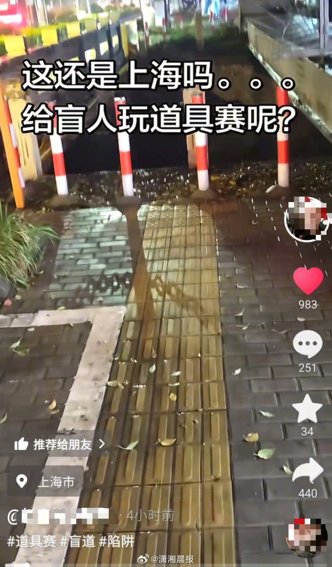 【#上海一处盲道径直通向河道#,#当地回应一盲道径直通向河道#:设有提示盲道但仍存在风险,会进行整改】2026年3月26日,一网友发视频称在上海一盲道上行走时差点掉进坑里。据画面显示,盲道尽头处设有警示装置,但仍有不少网友表示担忧,认为存在一定风险。据该网友透露,该盲道位于上海市朱家角古镇附近,自己当时正打算去吃饭。盲道径直通向一处河道,在尽头设有红白警示杆“自己当时在玩手机,差点掉进去”。视频发布后,有不少人在评论区告诉他:盲道尽头的圆点盲道为“停止线”,提醒盲人到此处后就不可以继续通行了,但该网友表示,在“停止线”的左侧为绿化带指示牌,右侧为水泥墩子,并没有新的行进盲道。据《无障碍设计规范》(GB 50763-2012)显示,“提示盲道”是指表面呈圆点形,用在盲道的起点处、拐弯处、终点处和表示服务设施的位置以及提示视觉障碍者前方将有不安全或危险状态等,具有提醒注意作用的盲道。“行进盲道”是指表面呈条状形,使视觉障碍者通过盲杖的触觉和脚感,指引视觉障碍者可直接向正前方 继续行走的盲道。3月26日中午,·晨视频记者拨通上海市城建服务热线反映了该情况。两小时后,上海市青浦区建管委下属道运中心回电,工作人员称,经朱家角镇相关部门实地核实后,该盲道具体的位置是在沈巷镇沈砖公路,该盲道尽头设有“提示盲道”,并且有几根红白警示杆,但是并没有完全围住河道,所以还是“挺危险的”。道运中心已经联系了沈砖公路的道路养护,经养护单位现场核实后会进行整改和处理。潇湘晨报·晨视频记者 胡飞龙 上海