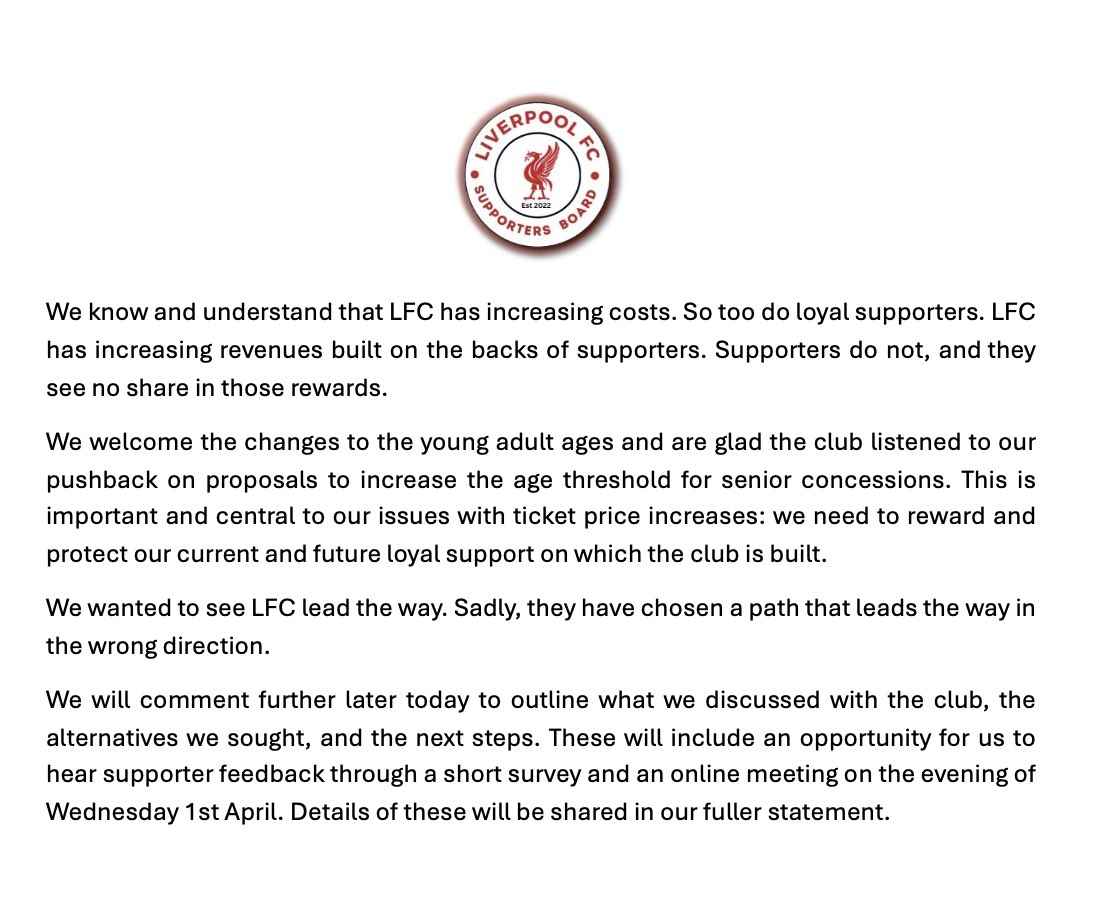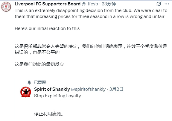 球迷委员会周四表示,在 “全球局势不确定的时期” 采取这一举措,他们 “极度失望”。“自 2 月初以来,我们就与俱乐部进行了直接谈判,” 声明写道,“此前在去年 10 月,我们还与俱乐部董事会及所有者进行过会面。我们始终明确提出诉求:希望冻结票价两个赛季,以响应球迷协会‘停止剥削忠诚’的运动,并争取与俱乐部共同寻找不会增加球迷负担的替代方案。我们本以为这是俱乐部践行‘意义非凡’理念的机会:与其他俱乐部不同,坚守对球迷忠诚的支持,共同制定方案,而不是把成本转嫁给球迷。我们希望利物浦能成为表率。遗憾的是,他们选择了一条走向错误方向的道路。”