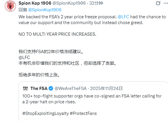 自芬威入主俱乐部以来,Kop看台的现行单场门票价格已超过15年未上调,而同期全国累计通胀率已达45%。
