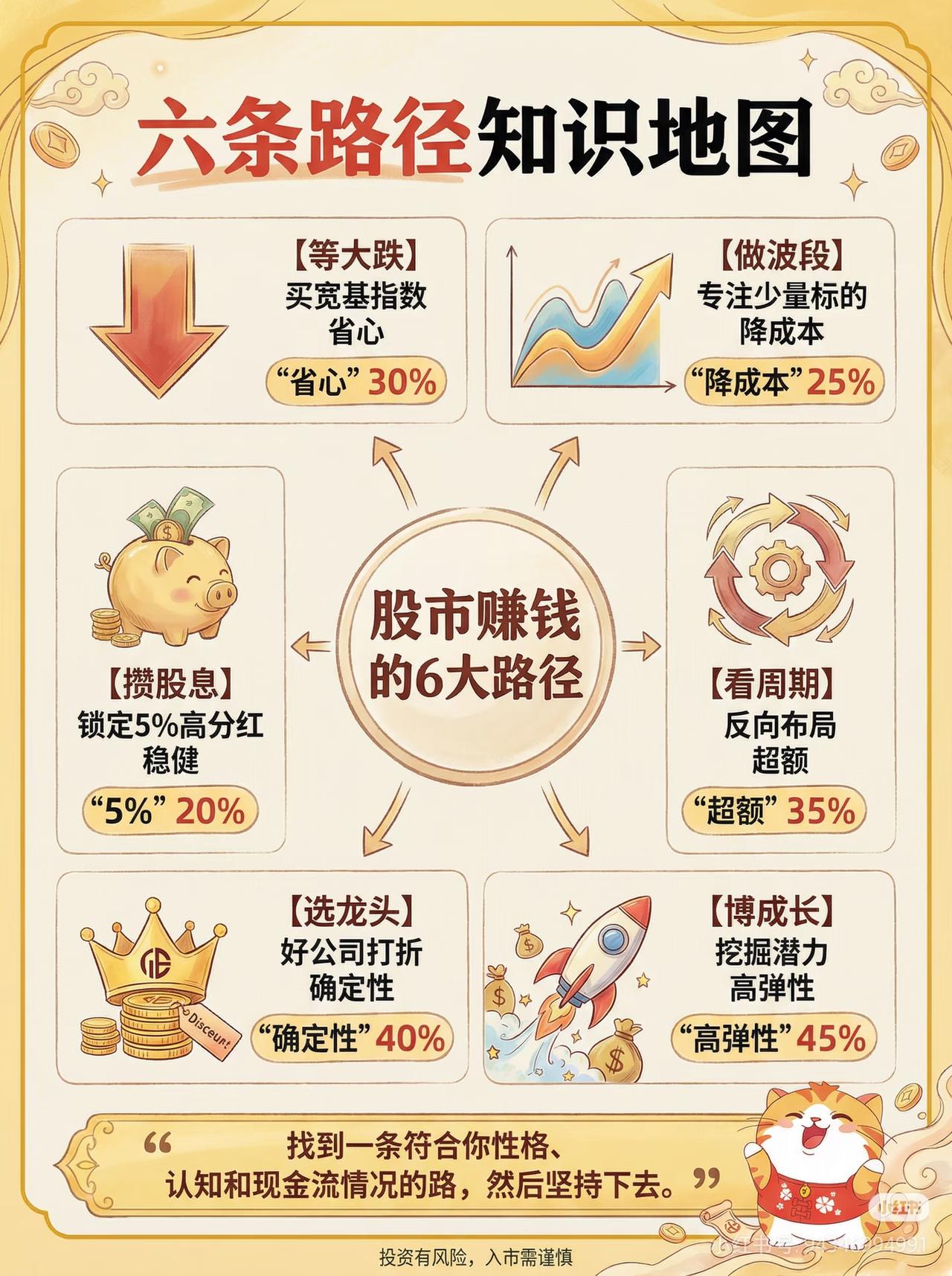 股市6大赚钱路径!新手对号入座,不做韭菜 别再天天追涨杀跌了!我在股市摸爬滚打这么多年,总结出6条实打实的赚钱路径,没有花里胡哨的操作,全是能落地的思路,不管你是新手还是老手,都能直接对号入座! 1️⃣ 等大跌,买宽基指数|省心30% 不选股、不盯盘,主打一个“别人恐慌我进场”。平时该上班上班,只拿闲钱,等市场暴跌扫货宽基指数,不用天天盯着K线,上班族闭眼选,稳字当头! 2️⃣ 做波段,专注少量标的|降成本25% 弱水三千只取一瓢,别盯着一堆票瞎忙活。只选2只基本面扎实的,涨了卖、跌了买,反复做T降成本,不用频繁操作,有空闲时间的就能玩。 3️⃣ 攒股息,锁高分红|稳健20% 把股票当收租的“商铺”!找股息率5%左右、现金流稳的大厂,估值低时买入长期拿,分红+股价翻倍双重收益,求稳的朋友直接抄。 4️⃣ 看周期,反向布局|超额35% 人多的热门板块别去,反向找跌了几年、没人问但刚需的低估板块,耐心等轮动,别人都在抢热点时,逆向布局反而能赚超额。 5️⃣ 选龙头,好公司打折买|确定性40% 数月亮不数星星,只盯行业龙头。等它们被误杀、价格打折时分批重仓,赚价值回归的倍数级增长,懂行的朋友直接拿捏。 6️⃣ 博成长,挖潜力小龙头|高弹性45% 找市值小、空间大、有护城河的初创龙头,成长潜力拉满,但要扛得住大波动,对行业理解深的朋友,靠眼光赚高弹性收益。 💡 核心提醒:6条路没有绝对完美,关键是找到符合自己性格、现金流的那一条,坚持下去!股市不是赌运气,是靠认知和纪律,管住手、耐住性,普通人也能赚! 股票 股市 投资理财 新手炒股 基金