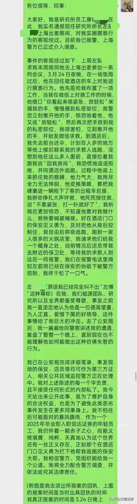 这个瓜你吃了吗。左所长才42岁,人长得是风流倜傥仪表堂堂,而且又拥有光鲜的履历,身为信达证券研究所的所长,按说不会如此饥渴不顾自己形象。 但是他偏偏搬起石头要狠狠地砸自己的脚。这一下好了,被上海的帽子叔叔扣住了还刑拘了,这事儿算是摊上了。 之前他树立的形象是德高望重、为人正直、爱惜下属。但是爱惜下属不是这么个爱惜法啊,方法错了,相当于偷鸡不成蚀把米。 喝了点酒就不知道东南西北了,不知道自己姓左还是姓右了。但是也不能让酒背这个黑锅,说明这个人骨子里就不是个好人,对女下属动手动脚,满口粗话,没想到这次马失前蹄了。既然已经停止工作了,既然查,就好好查一查,看看是不是惯犯,如果不是惯犯,那么就事论事。