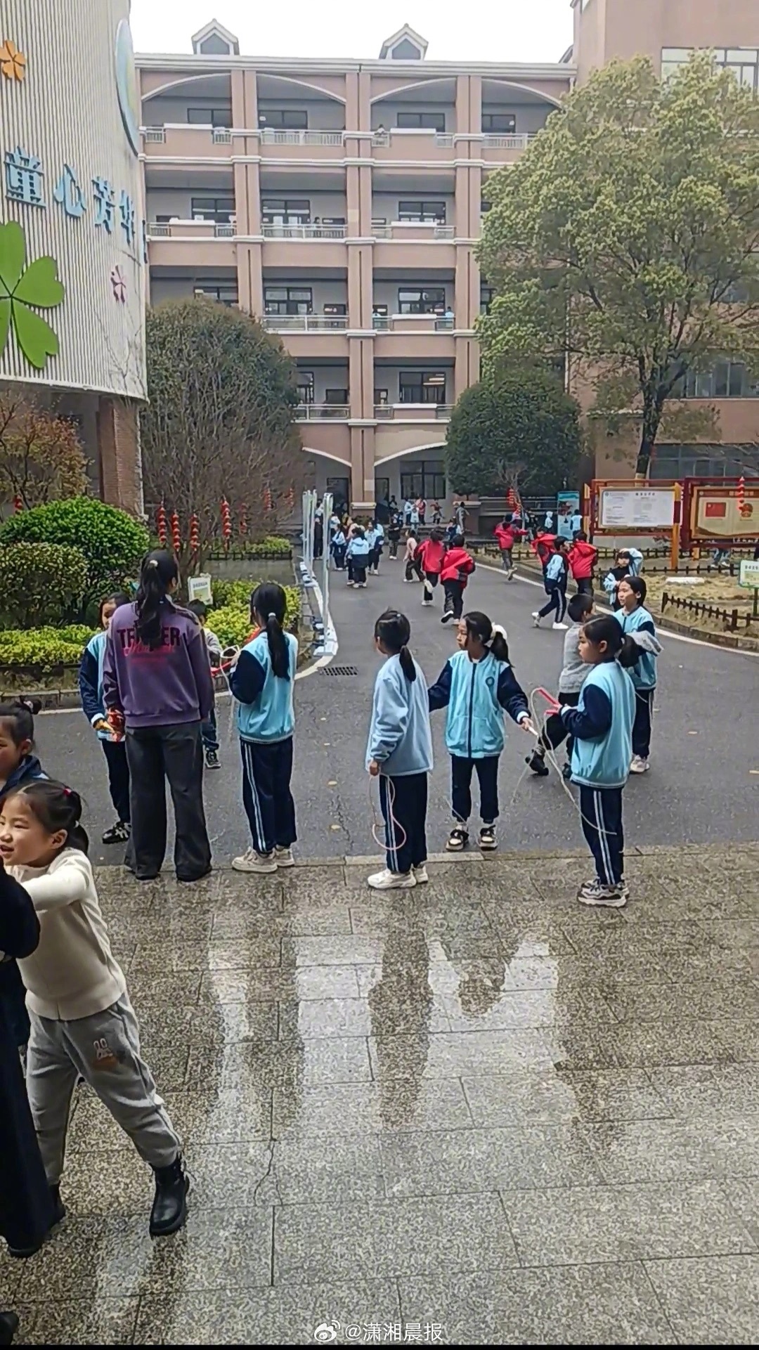 15分钟课间热闹非凡。学生们纷纷走出教室,在校园里,到处可见在踢健子、跳皮筋、跳房子、跳绳等活动的身影,欢声笑语充盈校园,处处洋溢着蓬勃朝气与运动活力。