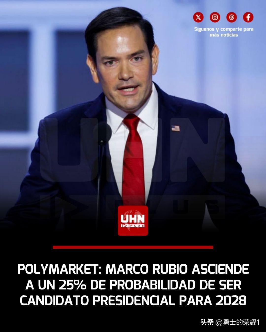 根据Polymarket的最新数据,国务卿马可.卢比奥在下一届总统选举中的支持率预测呈爆炸式增长,目前已稳固达到25%的支持率。卢比奥支持率的飙升反映了他对独裁政权实施的极限施压政策的成功,以及他在重塑美国战略联盟方面发挥的作用。实话实说纽约州州长纽森给盘盘一样都是垃圾。