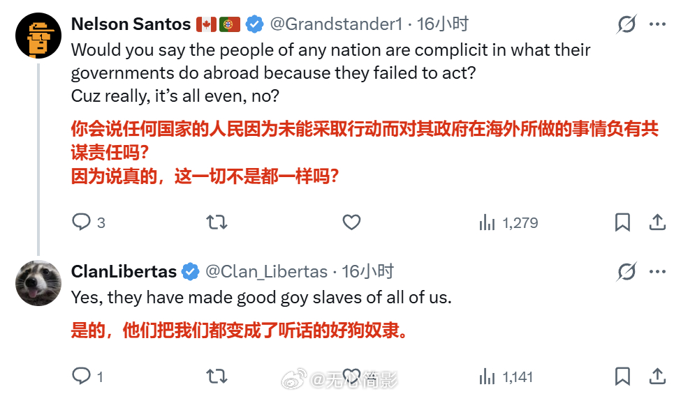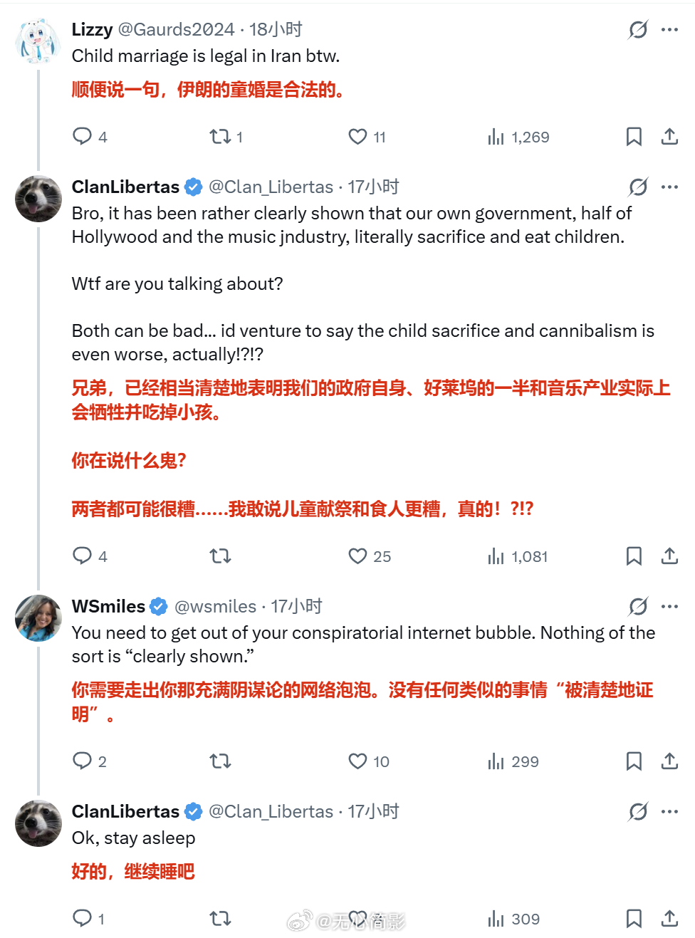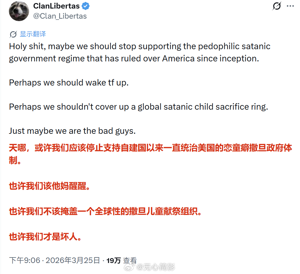 【美国网民称“也许我们才是坏人”】美国一名网民因为伊朗战争而呼吁国人“醒醒”,他说:“或许我们应该停止支持自建国以来一直统治美国的恋童癖撒旦政府体制,也许我们不该掩盖一个全球性的撒旦儿童献祭组织,也许我们才是坏人。”他的评论区很热闹,有支持他的,有更多反对他的,反对伊朗的理由出现的最多的是说伊朗的宗教允许童婚。这就很搞笑了,这群批评伊朗的美国人里没有一个提到美国多个州也允许童婚,特别是美国某些特定宗教,也没提到美国中东“盟友”们有多少允许童婚的,更没提到美国的爱泼斯坦阶层里多少喜欢小男孩小女孩的。所以说,如果单以【支持童婚的国家都应该炸烂】这一原则的话,我是支持把地球上所有这样的国家都炸烂的,谁也别例外。