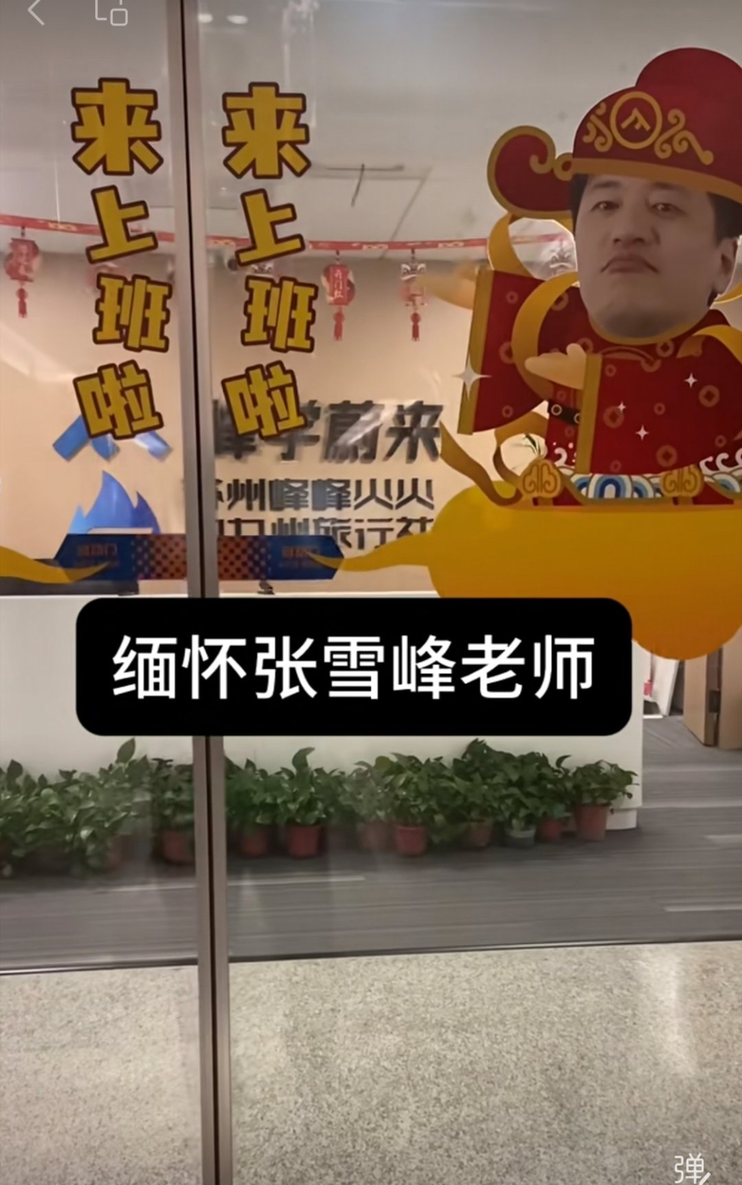 张雪峰老师创办的公司峰学蔚来的大门和前台,门上挂的居然是张雪峰cos财神照片,还写着来上班啦。他们公司的名字好有意思啊,苏州峰峰火火闯九州旅行社有限责任公司。。。能起出这样名字的,肯定是个有趣的灵魂。#张雪峰##峰学蔚来#