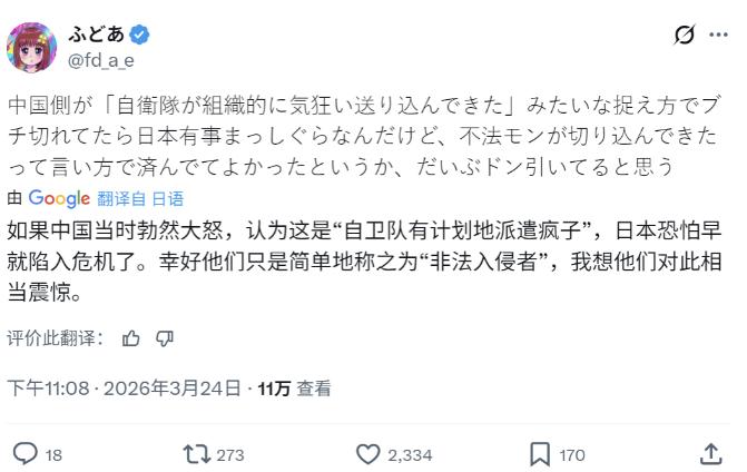 翻完日本社交媒体,一个感受:连不少日本网友都觉得,中国这次 “克制过头了”。 假如是反过来的情况发生,在日本,右翼的逻辑里哪怕只是稍微越界,他们大概率会立刻扣帽子: “这是对日本的宣战行为!” 3 月 24 日上午,23 岁的日本陆上自卫队三等陆尉村田晃大,不走正常访客流程、不提前做任何报备,直接从隔壁大楼翻墙闯入中国驻日使馆,随身携带 18 厘米长的刀具,当场扬言要以所谓 “神的名义” 杀害中方外交人员。 而且这个村田晃大不是普通民众,是正儿八经的日本陆上自卫队现役军官,今年 1 月才从干部候补生学校毕业,3 月 15 日刚晋升为三等陆尉,按说正是前途光明的时候,却干出这种极端又危险的事。 3 月 23 日中午,他就从自己所在的宫崎县虾野驻屯地请假出发,搭乘高速巴士和新干线赶到东京,晚上没找地方住宿,就在网吧凑活了一夜,期间还在东京都内特意买了那把 18 厘米长的刀具,全程目的性极强。 3 月 24 日上午 9 点左右,村田晃大避开所有安保检查,绕到中国驻日使馆隔壁的大楼,直接翻墙闯入使馆院内,一进来就口出狂言,声称要以 “神的名义” 杀害中方外交人员。 还好使馆工作人员反应迅速,第一时间将他控制住,没有造成人员受伤,之后就把他移交给了日本警方,警方是以涉嫌非法侵入建筑物的罪名逮捕他的,到了 3 月 26 日,又将他正式送交检方处理。 面对这么严重的事件,日本方面的反应却格外敷衍。既没有向中方正式道歉,也没有明确表态会严惩凶手,只是轻描淡写地表达 “遗憾”。 3 月 25 日,日本内阁官房长官木原稔在记者会上说,本应遵守法律的自卫队员被捕,令人深感遗憾,还说已经加强了使馆周边的警力警戒,除此之外就没再多说,连一句像样的承诺都没有。日本陆上自卫队也只是表示会配合警方调查,没提任何具体的处罚措施。 更让人唏嘘的是,这件事在日本社交媒体上吵翻了天,不少日本网友看得很明白,他们留言说,一名现役自卫队军官,携带刀具翻墙闯入他国使馆,还扬言杀人,这根本不是简单的非法入侵,是严重的国际问题,日本政府必须认真履行责任,彻底彻查此事。 但与此同时,也有一些极端的日本网民,居然为村田晃大叫好,把他当成所谓的 “爱国者”,甚至留言说他 “做得对”。这种分裂的言论,恰恰暴露了日本社会当下的问题 —— 极右翼思潮正在不断蔓延,越来越多的人被误导,连基本的是非观都没了。 要是换成别的国家的人,哪怕只是不小心越了日本的边界,或者在日本使馆附近有一点可疑举动,日本右翼早就炸锅了,立马会扣上 “挑衅”“宣战” 的大帽子,到处喊着要报复、要制裁。 最明显的就是俄乌冲突爆发的时候,日本岸田文雄政府第一时间就高调谴责俄罗斯,说俄罗斯 “违反国际法”,还跟着美国搞了几十项对俄制裁,甚至喊出 “要让俄罗斯为侵略付出沉重代价” 的口号,那股义愤填膺的样子,仿佛自己是 “规则的捍卫者”。 可到了 2026 年 1 月,美国突袭委内瑞拉首都加拉加斯,强行控制马杜罗夫妇,这种明显违反《联合国宪章》和国际法的行为,国际社会一片谴责,日本却瞬间沉默了。 而中方这边,自始至终都保持着理性和克制,没有像日本右翼那样乱扣帽子、激化矛盾,但也绝不会纵容这种危险行为。 3 月 25 日,外交部发言人林剑在例行记者会上明确表态,中方已经在北京和东京向日方严正交涉,表达了强烈不满,指出这件事严重威胁了使馆人员的安全,扰乱了使馆的安宁,也损害了使馆的尊严, 日方没有切实履行好《维也纳外交关系公约》的义务,没能尽到保护中方外交人员和使馆的责任。 面对日本记者试图淡化事件,说村田晃大 “只是想和中国大使对话” 的荒谬说法,林剑直接反问:“你见过未经允许持刀进入使馆同大使交谈的先例吗?” 可日本方面还是想模糊焦点、逃避责任,但是这18 厘米长的刀具,已经属于管制刀具,携带这种刀具闯入使馆,还扬言杀人,这已经不是简单的 “表达意见”,而是赤裸裸的恐怖威胁,是对中方外交人员生命安全的严重挑衅,也是对国际法的公然践踏。 中国的克制,从来都不是没有底线的。我们始终保持理性,是因为我们不想激化矛盾,希望维护地区的和平稳定,但这并不代表我们可以接受任何挑衅。 如果日本政府继续敷衍了事,不彻底彻查此事,不严惩凶手,不遏制国内的极右翼思潮,今后还可能发生类似的事件,到时候,就不是 “克制” 那么简单了。