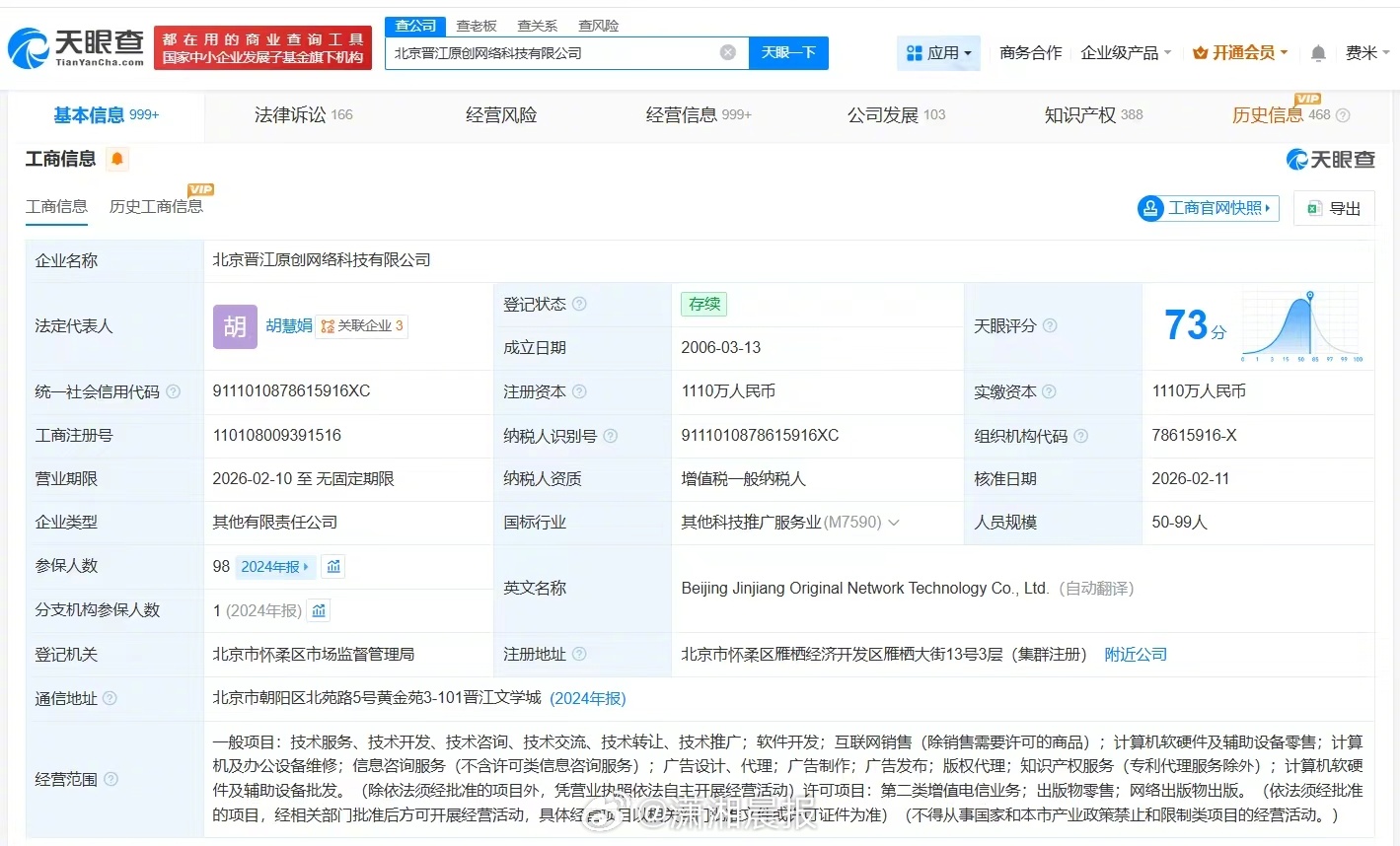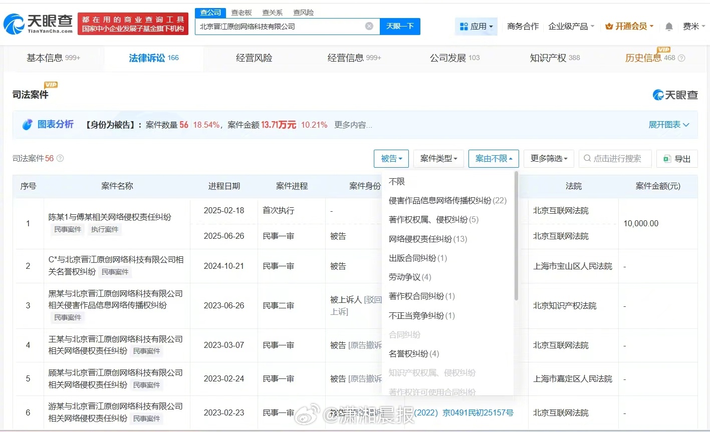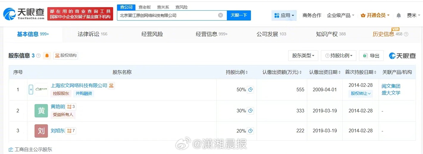 【#晋江文学城涉多起名誉权纠纷#,#晋江文学城涉多起网络侵权责任纠纷#】#晋江发情况说明# 据媒体报道,近日,晋江文学城因锁定小说《女主对此感到厌烦》引发舆论争议,公司对此回应,相关话题引发热议。 3月26日,记者查询天眼查发现,晋江文学城关联公司北京晋江原创网络科技有限公司成立于2006年3月,法定代表人为胡慧娟,注册资本1110万人民币,经营范围包括软件开发、互联网销售、计算机软硬件及辅助设备零售等,由上海宏文网络科技有限公司、黄艳明、刘旭东共同持股。法律诉讼信息显示,该公司曾因网络侵权责任纠纷、名誉权纠纷等被起诉。 北京