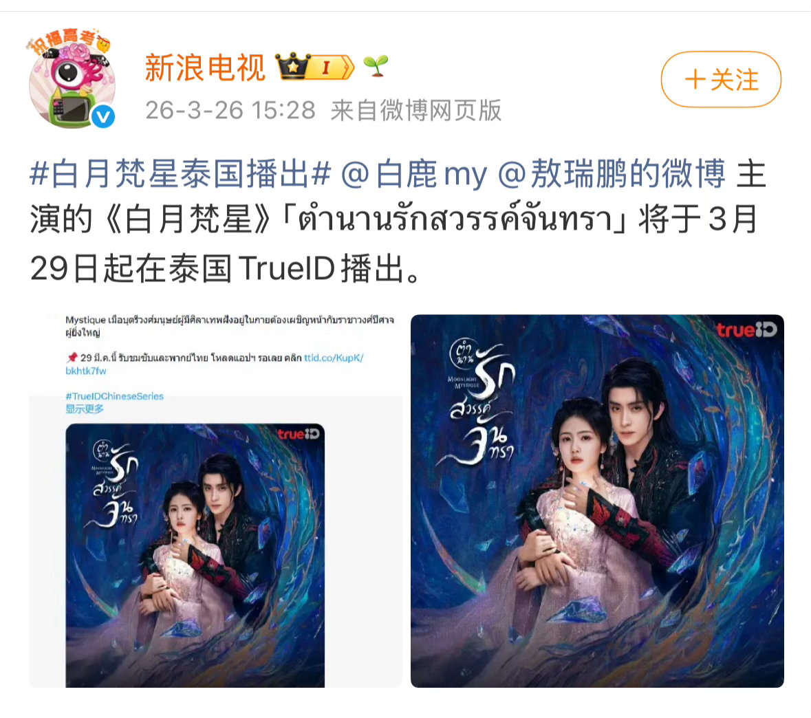 白月梵星329要在泰国播出,白鹿 敖瑞鹏又要吸粉了!