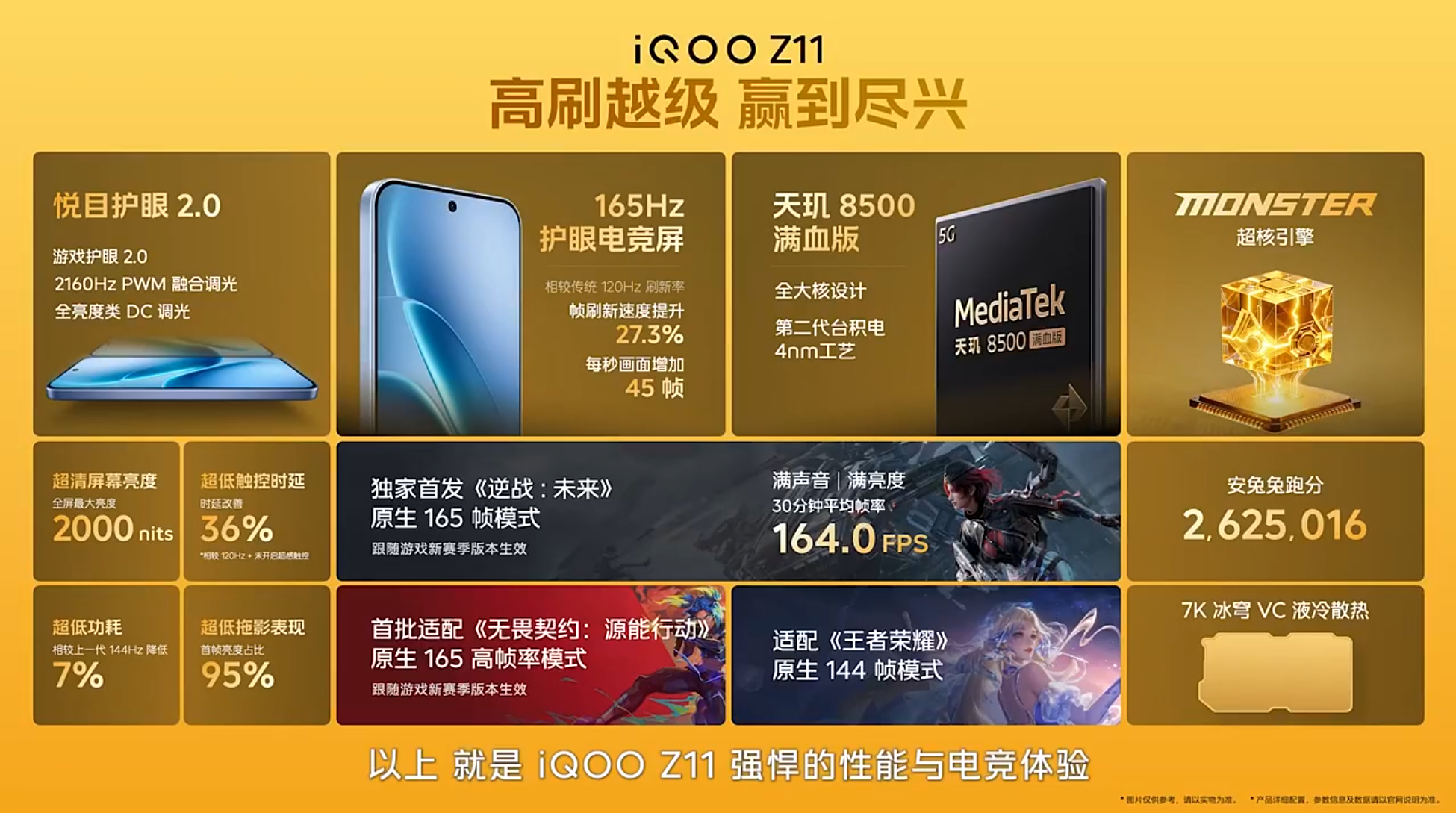 一图看懂iQOO Z11 的强悍性能 ,搭载天玑8500满血版、Monster超核引擎、7000mm² 冰穹 VC 液冷散热,跑分超262万。