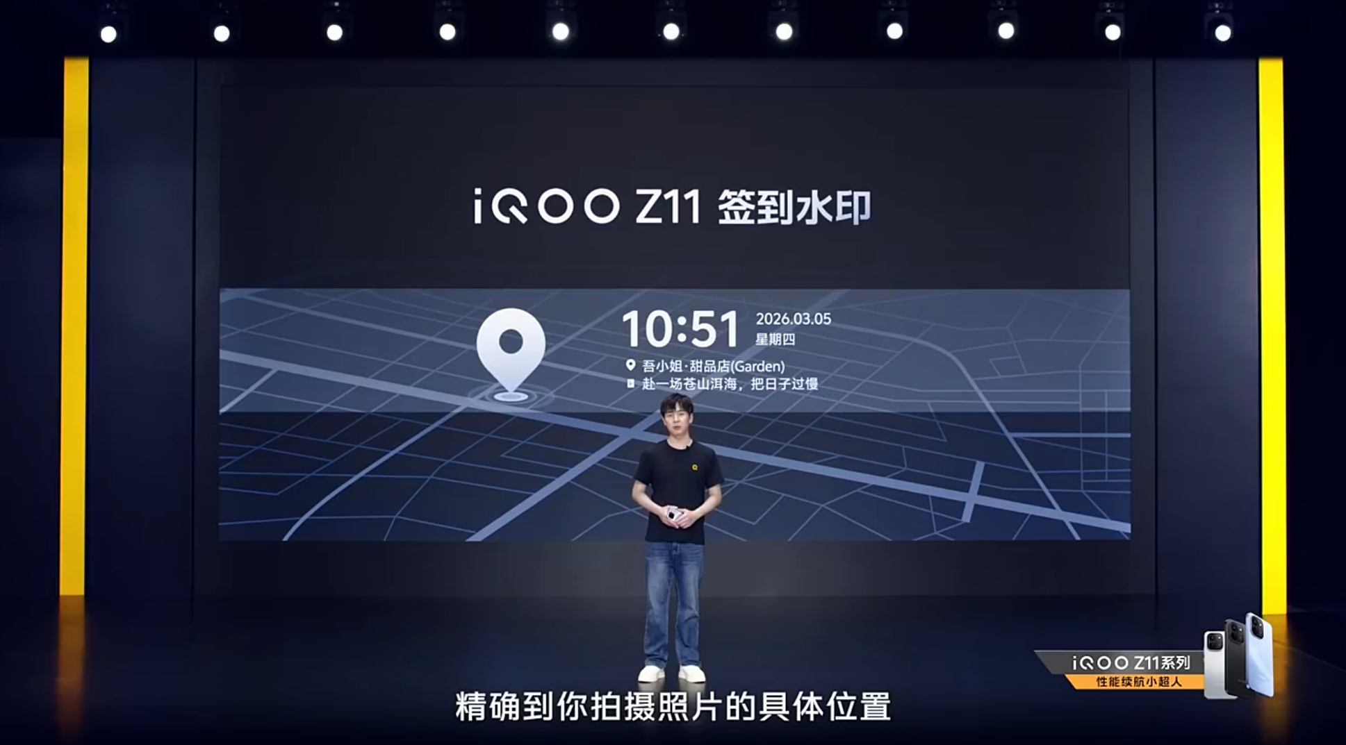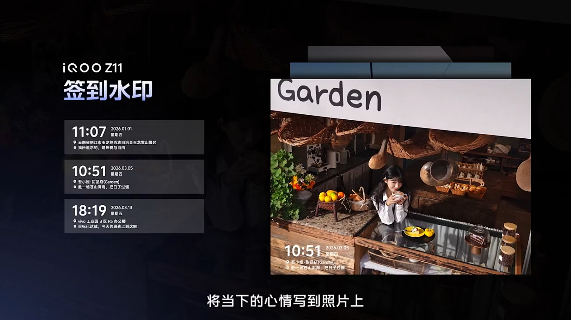 iQOO Z11首发签到水印,可以精确到某一个店铺,简直是旅游打卡神器