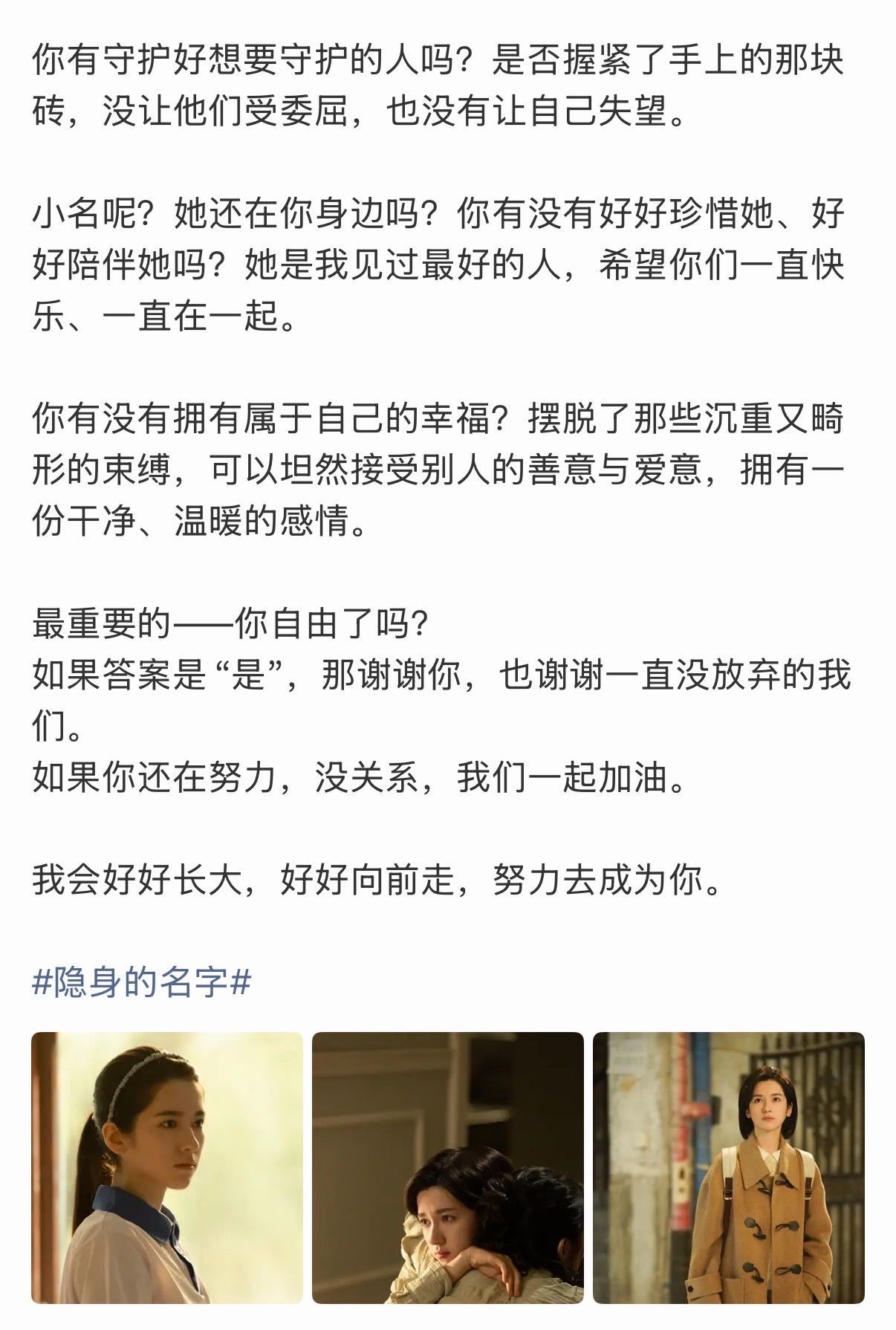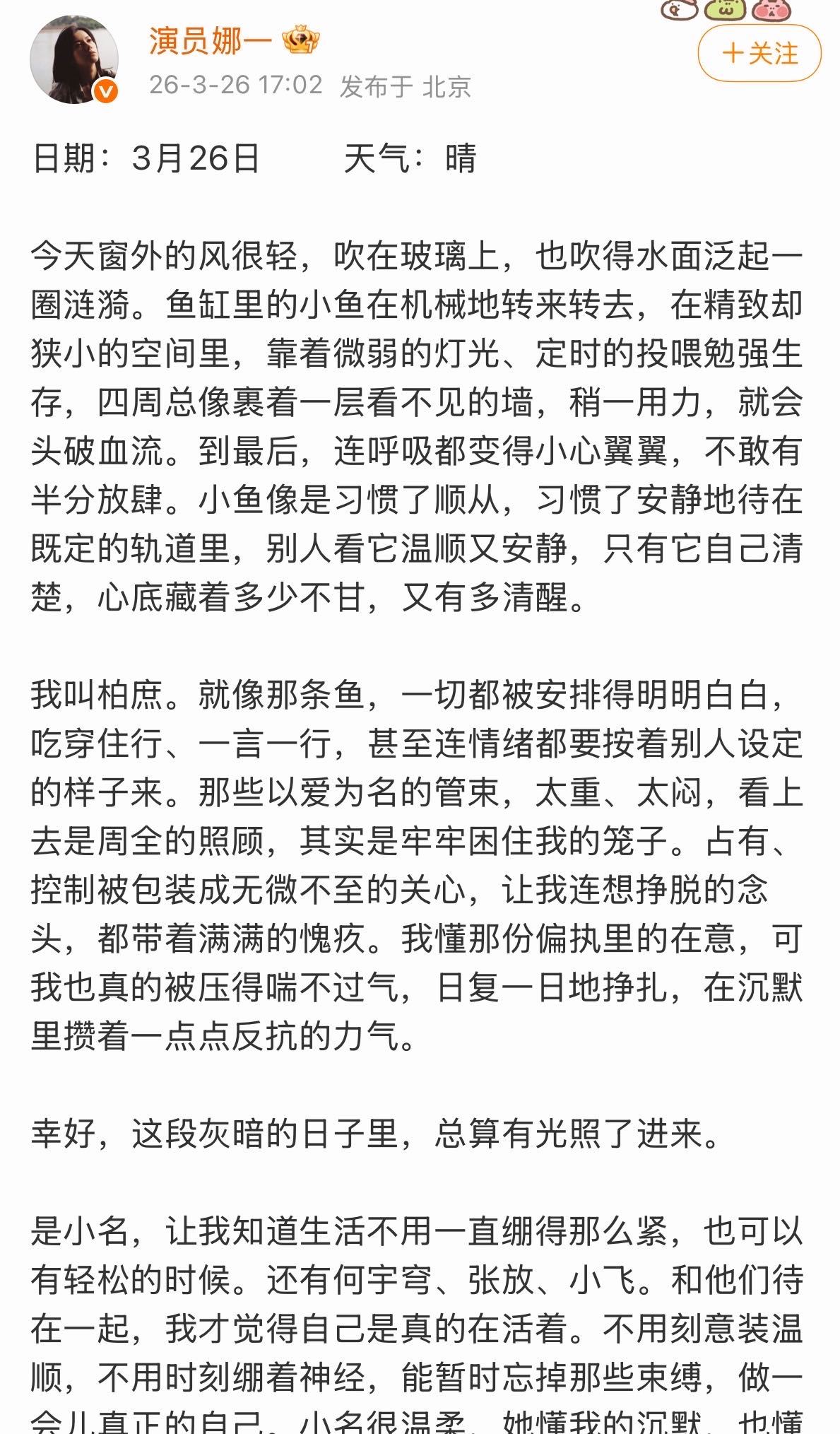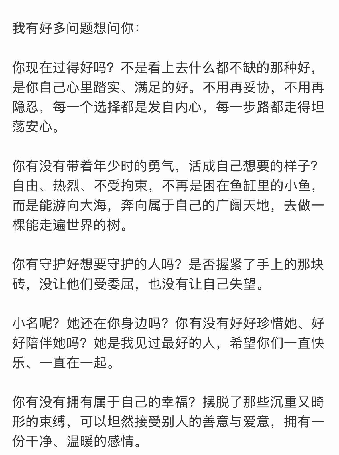 小柏庶困在过往,娜一却推开了那扇窗。告别不是忘记,是带着回忆前行。愿未来的她,笑得灿烂。娜一发长文告别小柏庶大小柏庶跨时空对话