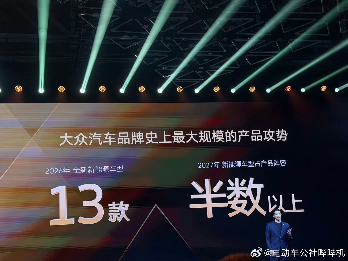 大众宣布,将迎来「品牌史上最大规模的产品攻势」,2026年推出13款全新的新能源车型,到2027年,新能源车型将占到大众车型的半数以上,成为主流。