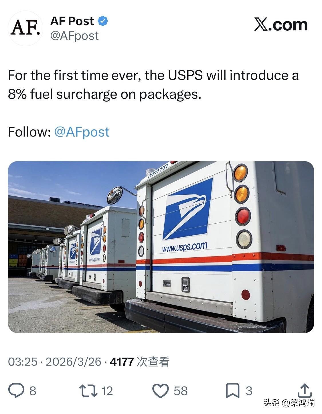 根据《华尔街日报》及美联社等主流媒体在 2026 年 3 月 25 日的报道,美国邮政总局 (USPS) 计划首次对包裹征收 8% 的燃油附加费。这一举措旨在应对因地缘政治冲突(如美伊冲突)导致国际油价持续飙升而大幅增加的运输成本。 以下是有关该政策的关键细节: 首次征收:这是 USPS 历史上首次打破多年惯例,直接针对包裹类别加收此类附加费。 收费标准:目前披露的拟定费率为 8%。 实施背景: 能源成本压力:由于运输燃料成本不断攀升,USPS 必须通过加价来弥补财务缺口。 市场动态:长期以来,USPS 的竞争对手如 UPS 和 FedEx 都会根据油价波动动态调整燃油附加费。 潜在影响:对于依赖 USPS 寄送包裹的小型零售商和电商卖家(如 Etsy 平台卖家)而言,物流成本将直接上涨。