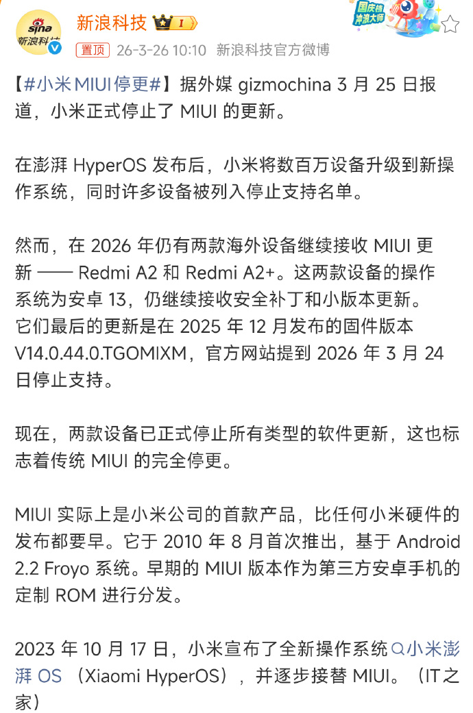 小米正式终止MIUI系统更新:15年经典落幕3月25日,据报道,小