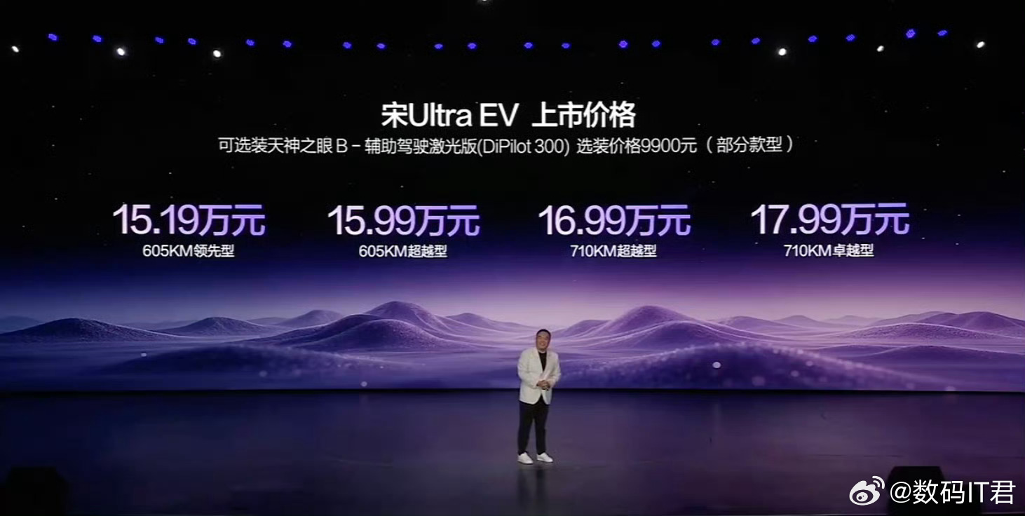 比亚迪宋Ultra EV售价公布:15.19万元起,标配云辇-C、天神之眼-C、第二代刀片电池+闪充技术,送一年免费闪充,可选装天神之眼-B,这车价格,属实不错~宋Ultra全系标配闪充15.19万起智驾数码团