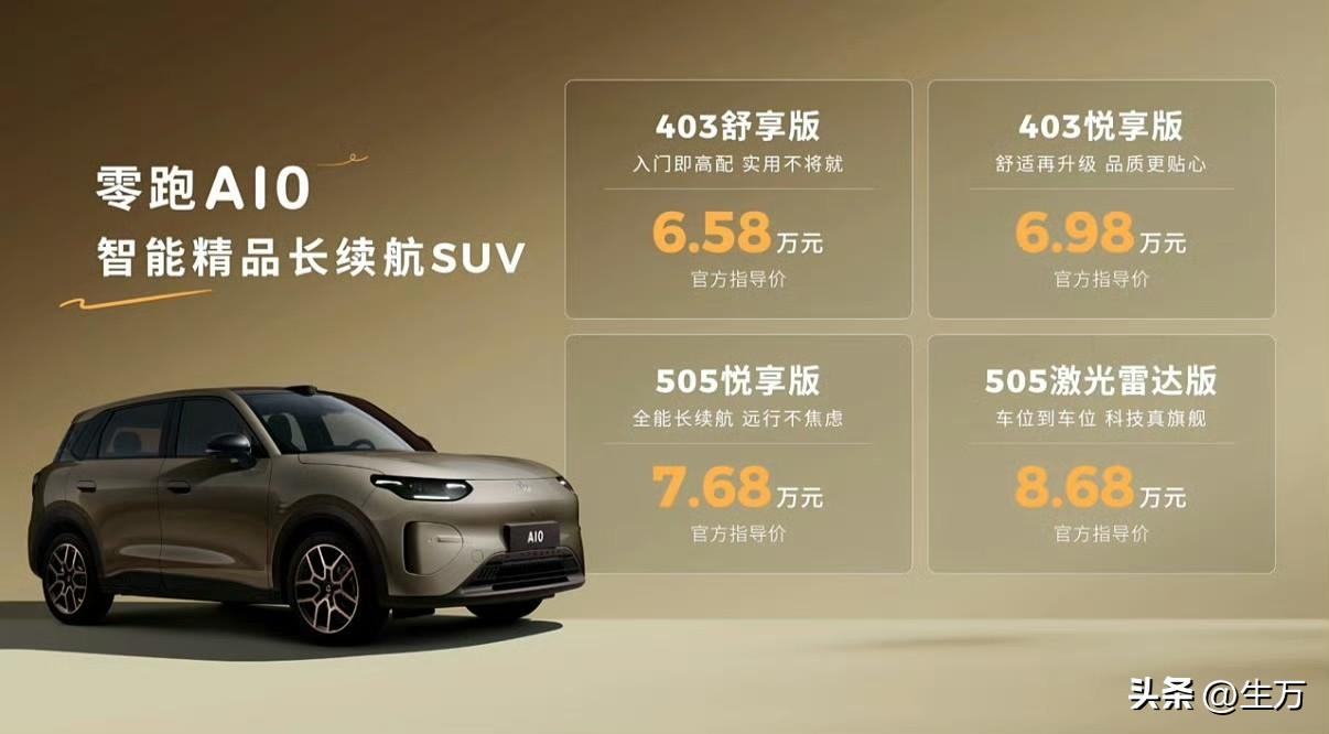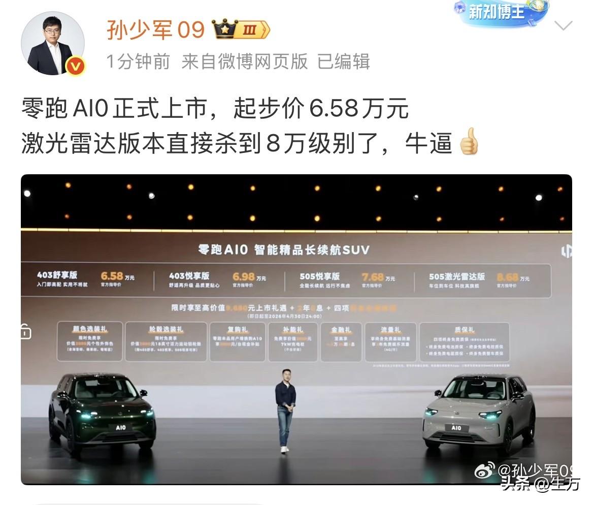 孙少军: 6.58万,零跑AI0价格出来了! 就在刚才,孙绍俊在社交网络上转发了领跑的发布会,这次他们发的这个A系列的小车,可以说是给同行一点小波澜,因为这个看起来是紧凑型的,但是人家起步价直接弄到了六万多,而且几个版本当中,激光雷达版本直接干到8万级别了,可以说是相当的有竞争力。 所以这个价格就直接与五菱宏光系列,以及比亚迪的入门级系列,等等同行几万块钱的入门产品,形成了直接的竞争关系。 估计之前很多人都没有料到,这个车会把价格压得这么极限,说明在几万块钱的市场空间里面,还是有利可图的,不然也不会有这么多品牌拓展这个市场。 毕竟再往下面看,还有一个市场,这个市场基本上都是五菱宏光迷你系列,与缤果系列在竞争,不知道还有没有同行加入进来!