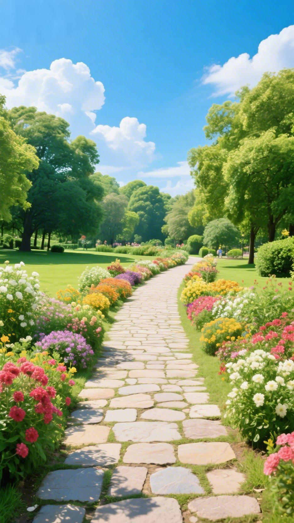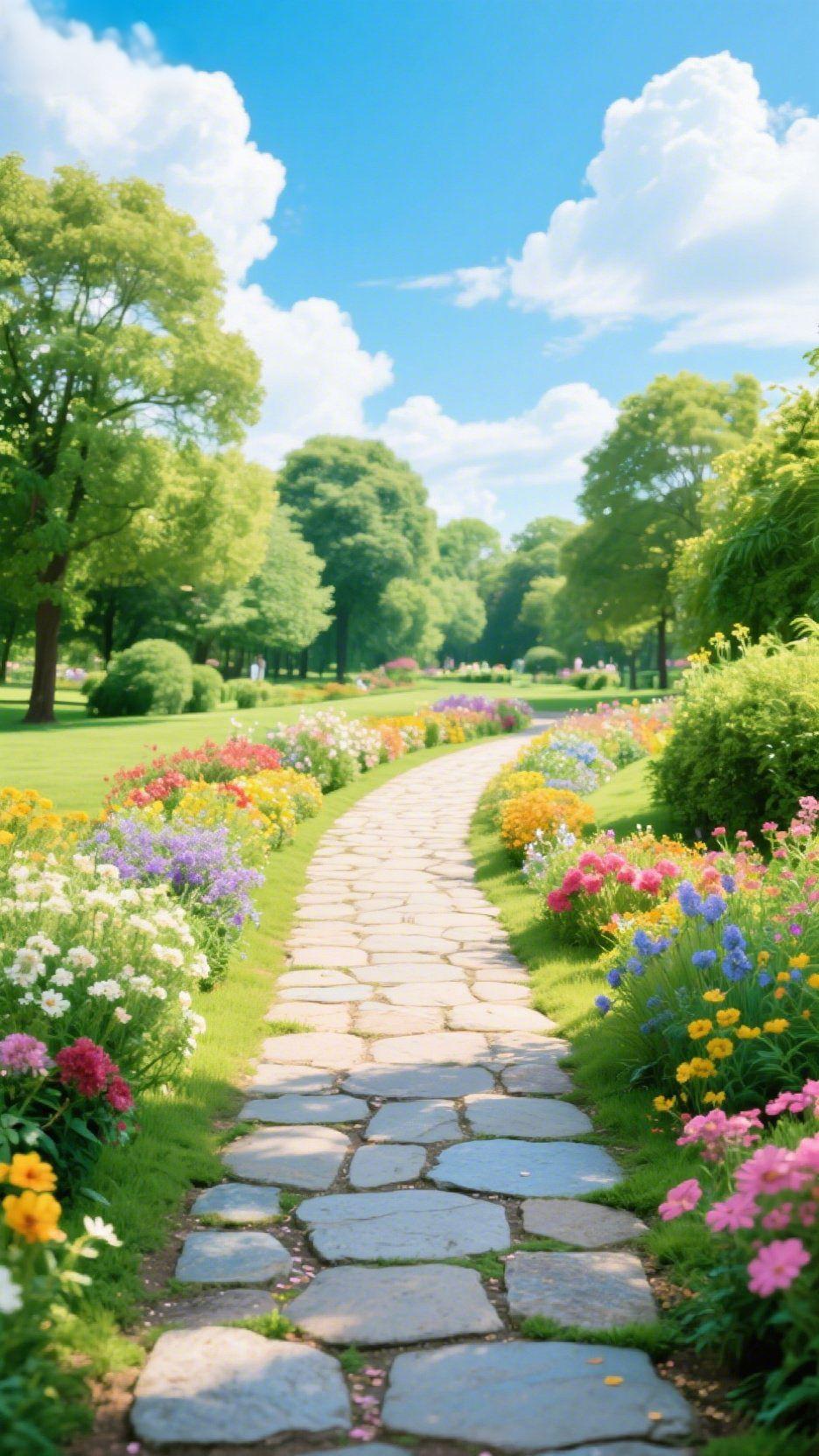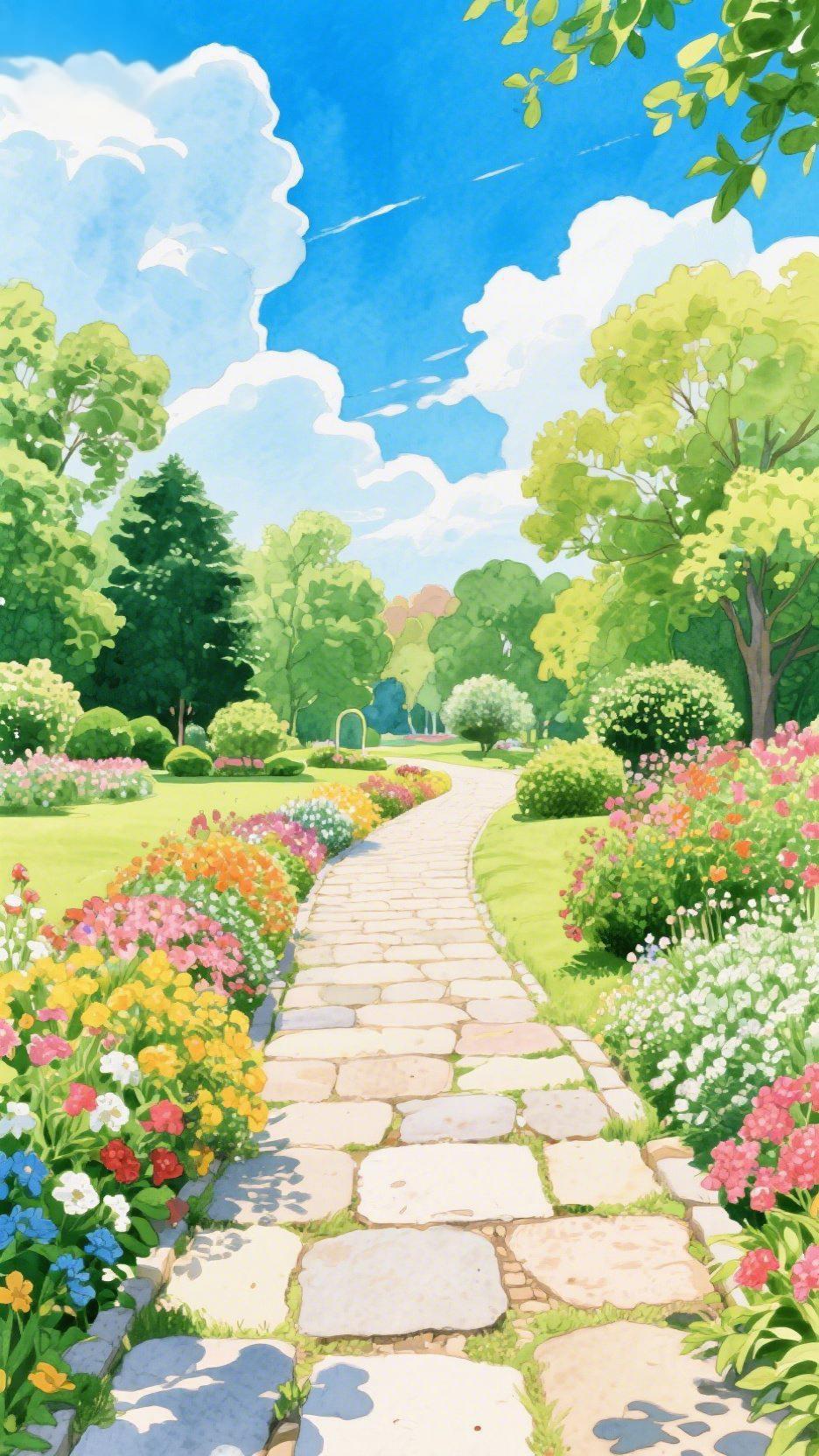 《花径浸晴光》 风裹着晴日的暖,撞进这条花铺的小径——石板缝里浸着草香,两侧花簇燃得热烈:粉瓣沾着碎光,紫穗摇着软风,黄朵像揉碎的阳光,连空气都裹着甜香。 云絮在蓝天里铺成软毯,树影剪碎日光,落在肩头是轻晃的暖。远处人影浸在绿里,像从画里漫出来的闲。 踩在石板上,花影缠过脚踝,风掠过发梢时,忽然懂了:最鲜活的温柔,是晴日里的花径,把日子都染成了晃眼的甜。 晴日花径温柔 治愈花园时光