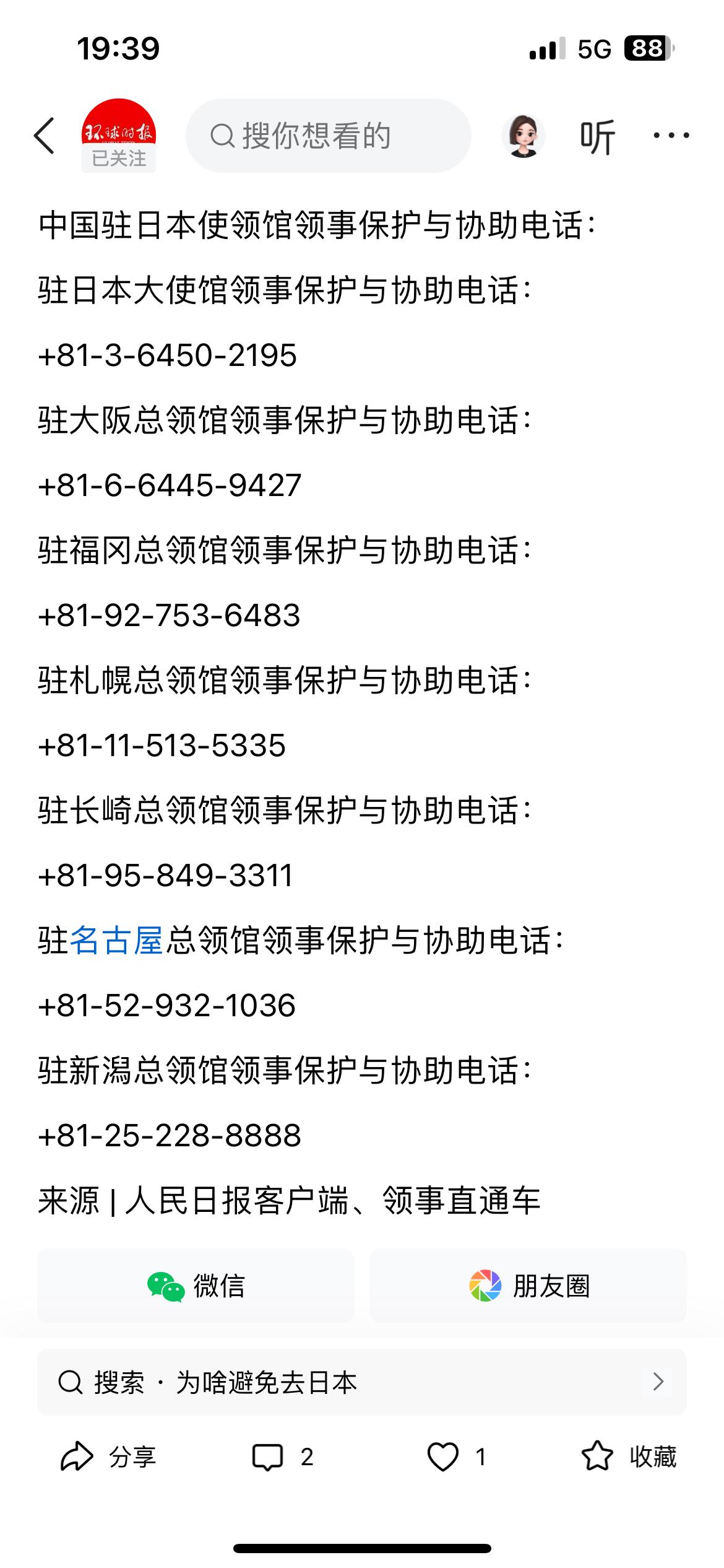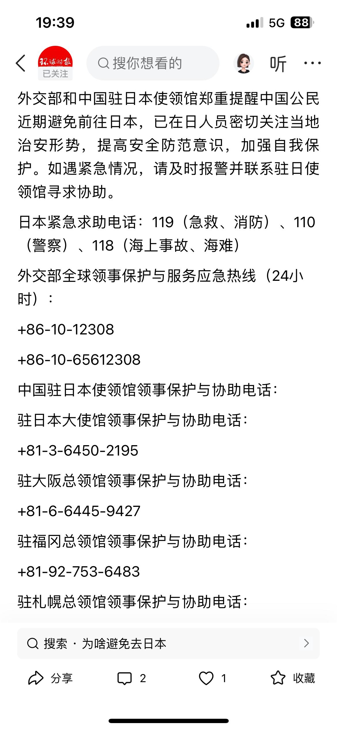 大家要听话,外交部和中国驻日使领馆郑重提醒,中国公民近期避免前往日本!注意,是郑重提醒避免前往日本,不是慎重,不是建议,是郑重、是避免前往日本! 这样的郑重提醒大家要听得进去!避免前往日本!毕竟日本自卫队现役官员持刀闯入中国驻日大使馆,可见中国公民在日本面临的治安环境恶化,所以大家还是避免前往日本!而已在日人员要密切关注当地治安形势!