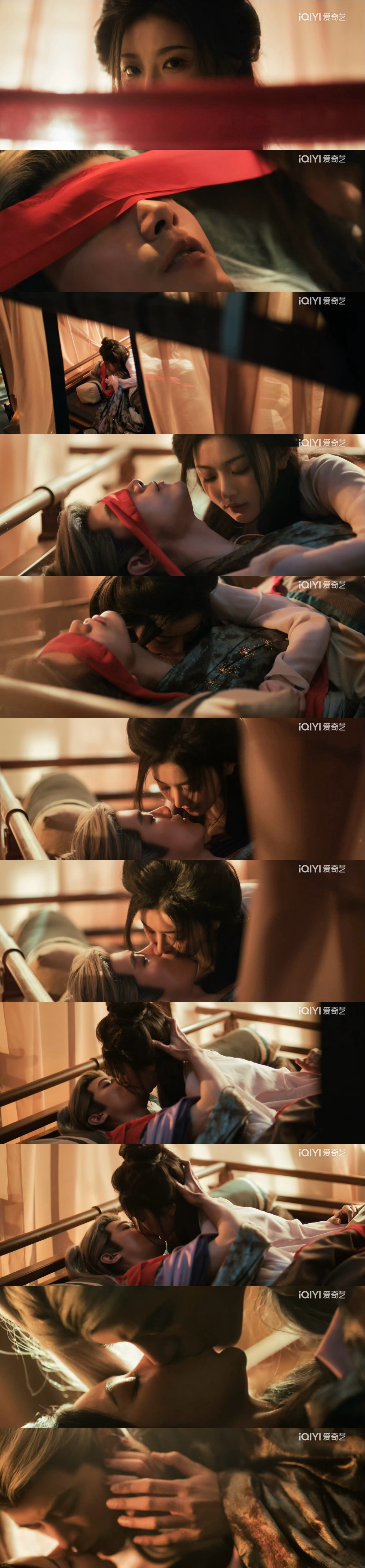 孔雪儿邓凯床戏红绸蒙眼虎符吻一幕中,孔雪儿饰演的俞浅浅用红绸遮目,口衔虎符主导二人互动,邓凯饰演的齐旻以“休闹,虎符还我”回应,台词与肢体动作相互拉扯,不齐而俞一出现,就知道这段戏要被记住了,张力特别足,不齐而俞虽然戏份少,但出场即是经典孔雪儿邓凯床戏