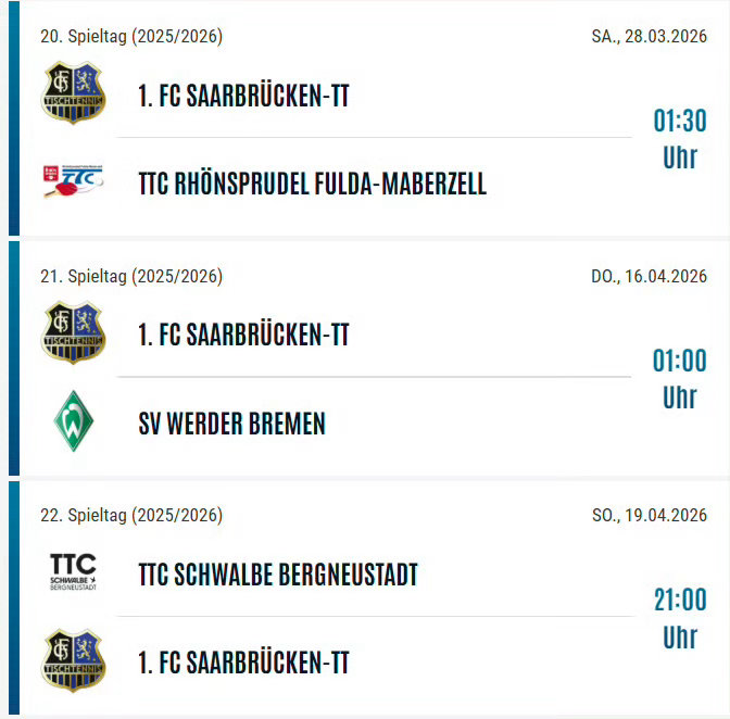 值得球迷期待的是,国乒名将樊振东确定将代表萨尔布吕肯出战本赛季剩余的德甲联赛,具体赛程如下: