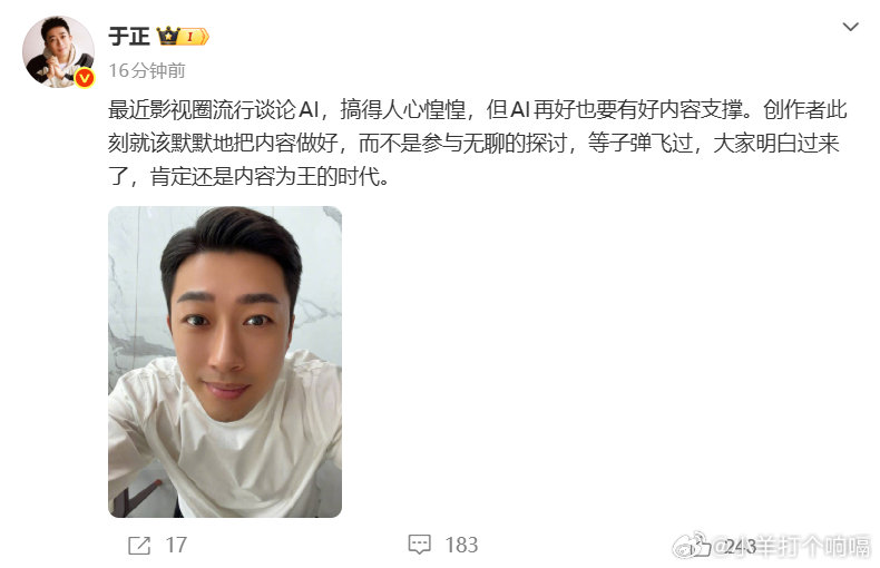 于正谈影视圈AI化于正说AI再好也要有好内容支撑于正这话说到点子上了!AI特效再炫,没有扎心的故事和演技,也就是个空壳子。内容为王,这才是硬道理。