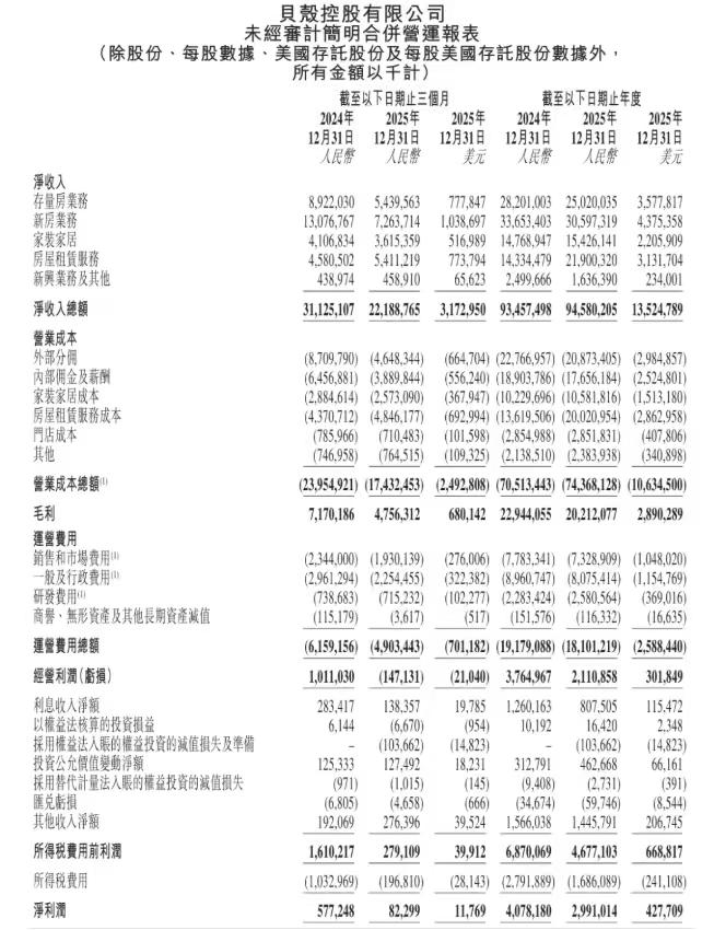 千亿贝壳,还在风雨中。 过去的2025年,我国房地产行业经历深刻重构,全国新房市场规模继续缩水,二手房交易量占比接近“半壁江山”,行业加速跑进“存量时代”。 事实上,在房地产深度调整的第五年,没有一家企业能独善其身。 就像房产服务行业龙头贝壳,本是独一档的存在。 起承转合间,房主质疑它压价,租户质疑它费用高,情绪集中却又无可奈何。 它连接买卖双方、参与价格形成,却又无法真正决定市场方向。反而一定程度上活成了行业与周期的晴雨表。 在众人的期待中,贝壳交出了一份复杂而微妙的成绩单:2025年总营收946亿元,同比增长1.2%;利润同比大幅下滑26.7%至29.91亿元。 收入增长与利润下滑的剪刀差,折射出这家曾经的“互联网改造标杆”正在经历一场深刻的“换血”。 是的,以往以规模取胜的发展模式,已经失灵了。 房产服务行业的核心逻辑,正从规模扩张走向专业服务。 贝壳董事长兼首席执行官彭永东曾在年报致辞中频繁提及“客户价值”“AI重塑”“效率驱动”。这听起来很美,但剥开华丽的辞藻,看到的却是一个正在经历剧烈“换挡期”的贝壳。