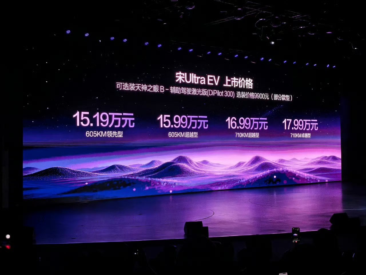 比亚迪宋 EV Ultra售价来了!605KM领先型 15.19万元710KM超越型16.99万元605KM超越型15.99万元 710KM卓越型 17.99万元
