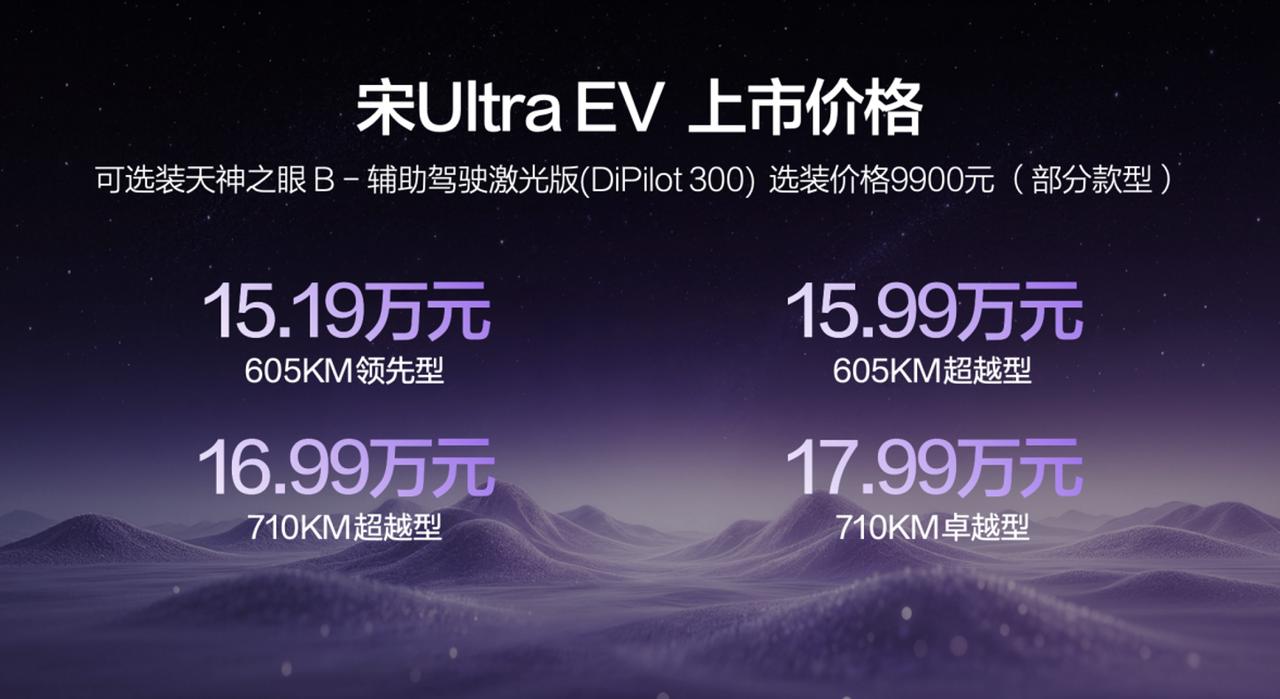 又是一台主流家庭严选闪充车,宋Ultra EV正式上市,给大家汇总一下信息: 1、推出4个版本,售价15.19万元-17.99万元 2、外观亮点是封闭式前脸、贯穿式星环灯带、龙睛LED大灯、贯穿式中国结尾灯、悬浮式车顶和隐藏式门把手,提供火岩灰、雪山白、烟岚紫、星河米、棕榈绿、曜石黑六种外观配色选择 3、内饰看点是12.3英寸全液晶仪表、15.6英寸中控屏、女王副驾和双50W无线快充等,提供海盐灰、暮云灰两款内饰颜色选择 4、长宽高分别为4850/1910/1670mm,轴距为2840mm,采用5座设计,具备150L前备箱、730L后备箱 5、全系标配云辇-C智能阻尼车身控制系统 、前麦弗逊/后五连杆独立悬架,搭载TBC高速爆胎稳行系统 6、可选装天神之眼B-辅助驾驶激光版(DiPilot 300),天神之眼 5.0搭载最新大模型版本,支持高快领航、城区领航和智能泊车功能 7、全系采用800V平台,提供240kW/305Nm、270kW/305Nm两种电机选择;提供69.07kWh/82.7kWh两种第二代刀片电池选择,分别对应CLTC续航 605km和710km;支持闪充,10%-70%仅需5分钟,10%-97%仅需9分钟,零下30度情况下20%-97%充电只多3分钟【来自懂车帝车友圈】
