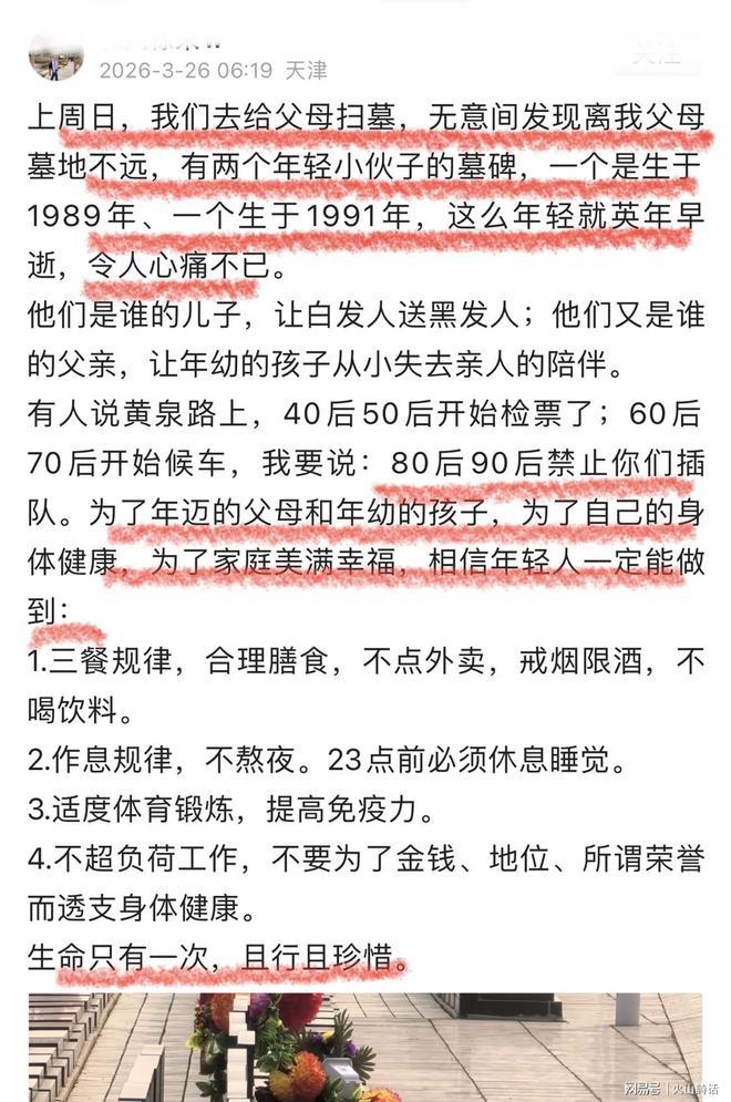 “太扎心了!”天津,一位网友去给父母扫墓时,无意间瞥见旁边立着两座墓碑,走近一看瞬间破防,这两个长眠于此的小伙子,一个出生于1989年,另一个出生于1991年!正值壮年却英年早逝,留下白发双亲和稚嫩幼子,令人心痛不已。网友:“80后90后,黄泉路上禁止你们插队!” 这位网友趁着清明时节去陵园祭奠双亲。 走在寂静的墓区里,离父母墓地不远处的两座年轻墓碑引起了她的注意。上前细看生卒年月,一个是1989年出生的80后,另一个是1991年出生的90后。三十出头的年纪,本该是家里的顶梁柱,是在职场打拼的黄金期,如今却化作了一抔黄土。 看着冰冷的石碑,网友满心酸楚,脑海里止不住地浮现出让人窒息的画面:他们是谁的儿子,让老父亲老母亲白发人送黑发人,哭干了眼泪?他们是谁的丈夫,让爱人永失依靠?他们又是谁的父亲,让年幼的孩子从小就在没有爸爸的陪伴中长大? 这两座年轻的墓碑,像一把尖刀戳破了成年人“拿命换钱”的现实,让人彻底看清了生命在意外和疾病面前的脆弱。 这件事被发到网上后,迅速引发了无数人的共鸣。 有人感慨,黄泉路上无老少,40后和50后开始检票了,60后和70后开始候车,但80后和90后的年轻人,绝对禁止你们插队! 大家纷纷呼吁,为了家庭美满幸福,年轻人一定要做到三餐规律、合理膳食、不点外卖,坚决戒烟限酒,不喝饮料。 这事儿说到底,就是给大家敲响了一记沉重无比的健康警钟。 在这个节奏飞快、压力山大的社会里,很多人为了金钱、地位和所谓的荣誉,超负荷工作,拼命透支着自己的身体,每天熬夜不到23点绝不睡觉。 可真到了倒下的那一刻才会明白,在生死面前,一切财富和名气都只是过眼云烟。生命只有一次,适度体育锻炼,提高免疫力,保重身体才是对父母和妻儿最大的负责。且行且珍惜,别让悲剧重演。 对此,你怎么看?