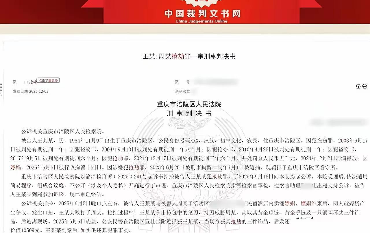 重庆,一男子约了女网友开房,完事后,不料,两人因为费用一事发生了争执,男子就把女网友打了,然后他又从包里掏出一把水果刀,硬是逼着女网友把项链、手链、耳环都给摘下来才肯罢休,当他拿到值一万多块的首饰后才离开,但是接下来女网友的做法让他后悔不已。 信息来源:中国裁判文书网 咱先说说这位“主角”王某吧:他1984年生人,前前后后有过四次故意犯罪记录,抢劫的、盗窃的都干过,好几次进进出出监狱,累计得坐七八年牢。 坐牢对他大概就像回老家似的,出狱后找不到活儿干,也没人愿意跟他过日子,他自己一个人过,可基本的吃穿住用还是得有。 结果,就在2025年6月5日这天,他又在网上和周某(化名)认识,俩人一拍即合,说好了“有偿发牌子”,然后就去民宿酒店开了房。 本来都说好了价钱,可事毕之后,周某觉得他服务不怎么地,想要打个折;王某狮子大张口,不答应,还跟人家吵起来。 话越说越激动,他先动粗,把周某打倒在床,还好没大碍。 周某一看不成,提了个求生愿——别再动手了。 可王某显然没长心眼,又掏出一把水果刀抵住人家,一句话不说,就要人家把金灿灿的首饰全给他。 没办法,周某只好乖乖摘下来,王某拿到手后才满意地转身走人。 周某回过神来,又气又恼,一分钱都没挣着,首饰倒丢了一万多块,赶紧跑到派出所报了警。 民宿的监控和周某提供的线索合在一起,警察火速锁定了王某,当天就把他抓了。 案子咋定的? 王某这可是“暴力胁迫拿财物”,符合《刑法》里抢劫罪的标准:先是拳脚相加,又拿水果刀吓唬人,足以让人失去反抗能力。 按法律规定,抢劫公私财物的,判三到十年都算正常;要是入户抢劫、持枪或者抢了人命,那就是更严重的情节,要十年以上、无期甚至死刑。 王某这回虽然没把人打重伤,也没入他家,但他用刀又是累犯,法院就没给他轻判,直接给了有期徒刑五年,还得罚一万元。 这个年头,动不动就“回家”几次的人,一点也不走运。 可别忘了,周某也得受点儿教训:因为俩人已经私下搞过那笔违法买卖,属治安管理处罚范围,她面临最高十五天行政拘留、再加上最多五千块罚款,光是教训就够她受用了。 这事儿在网上也引发热议:有人说王某“把监狱当第二故乡”,有人呼吁屡犯者该严惩,还真别指望能改。 还有人提醒大家,网上交友别太随便,那种有偿性交易不光碰不得,还没法讲法律保护,出了事连自己都赔进去。 这件案子也给大家提个醒:暴力胁迫拿财物,直接就得进看守所,还有社会该多出点力气,别让这些屡犯者一出狱又接着犯,给他们多点就业、帮教机会,也许能减少“老友叙旧”式的再犯罪。