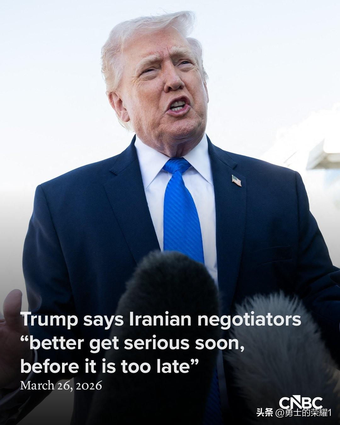 美国总统唐纳德·特朗普告诉伊朗,要么尽快认真对待与华盛顿的和平协议,要么承担后果。 "他们最好尽快认真对待此事,以免为时过晚,因为一旦发生这种情况,就没有回头路了,而且后果不堪设想!"他周四早些时候在Truth Social 上发帖说道。 总统形容伊朗谈判代表"非常不同寻常"、"很奇怪",并表示他们"恳求"美国达成协议,结束这场已经持续近四周的战争。 特朗普发表上述言论之前,华盛顿和德黑兰就和平谈判的进展情况发表了相互矛盾的声明。美国表示,双方一直在就一项和平计划进行谈判,而伊朗则否认与华盛顿有任何直接接触。伊朗这种货色主动找美国谈判,又死不承认与美国接触,典型的嘴硬身子软。