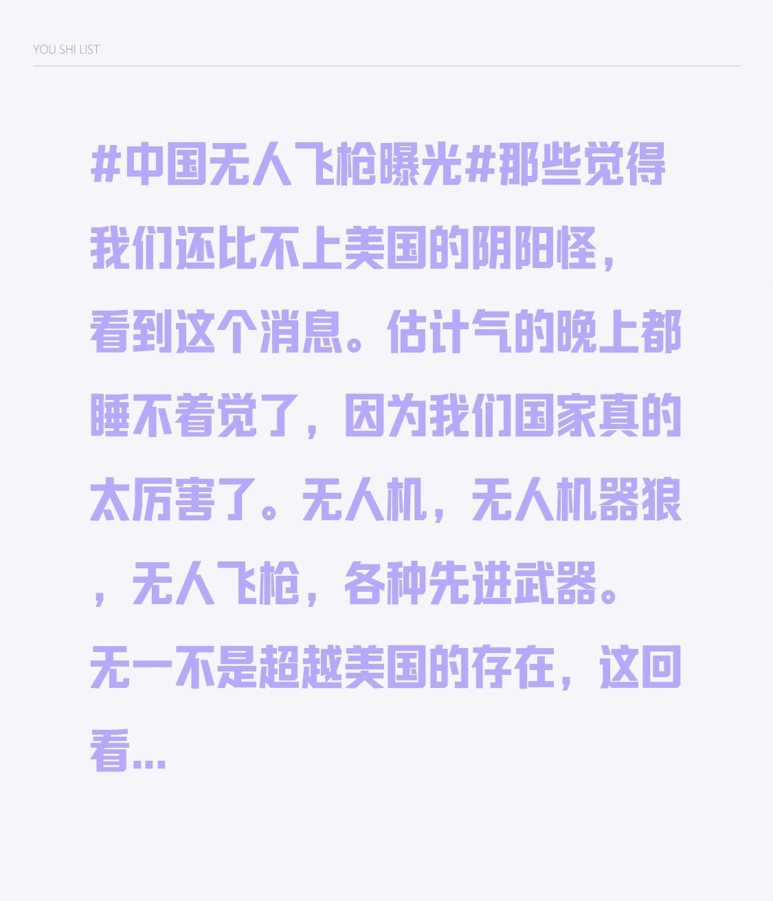 无人机,无人机器狼,无人飞枪,各种先进武器。无一不是超越美国的存在,这回看谁还敢说我们国家比不上美国。