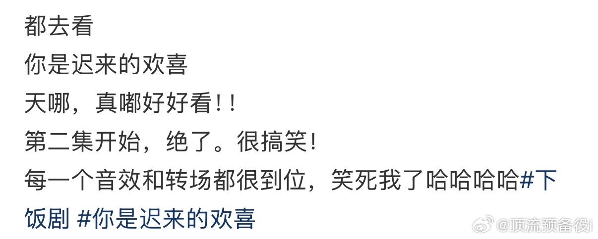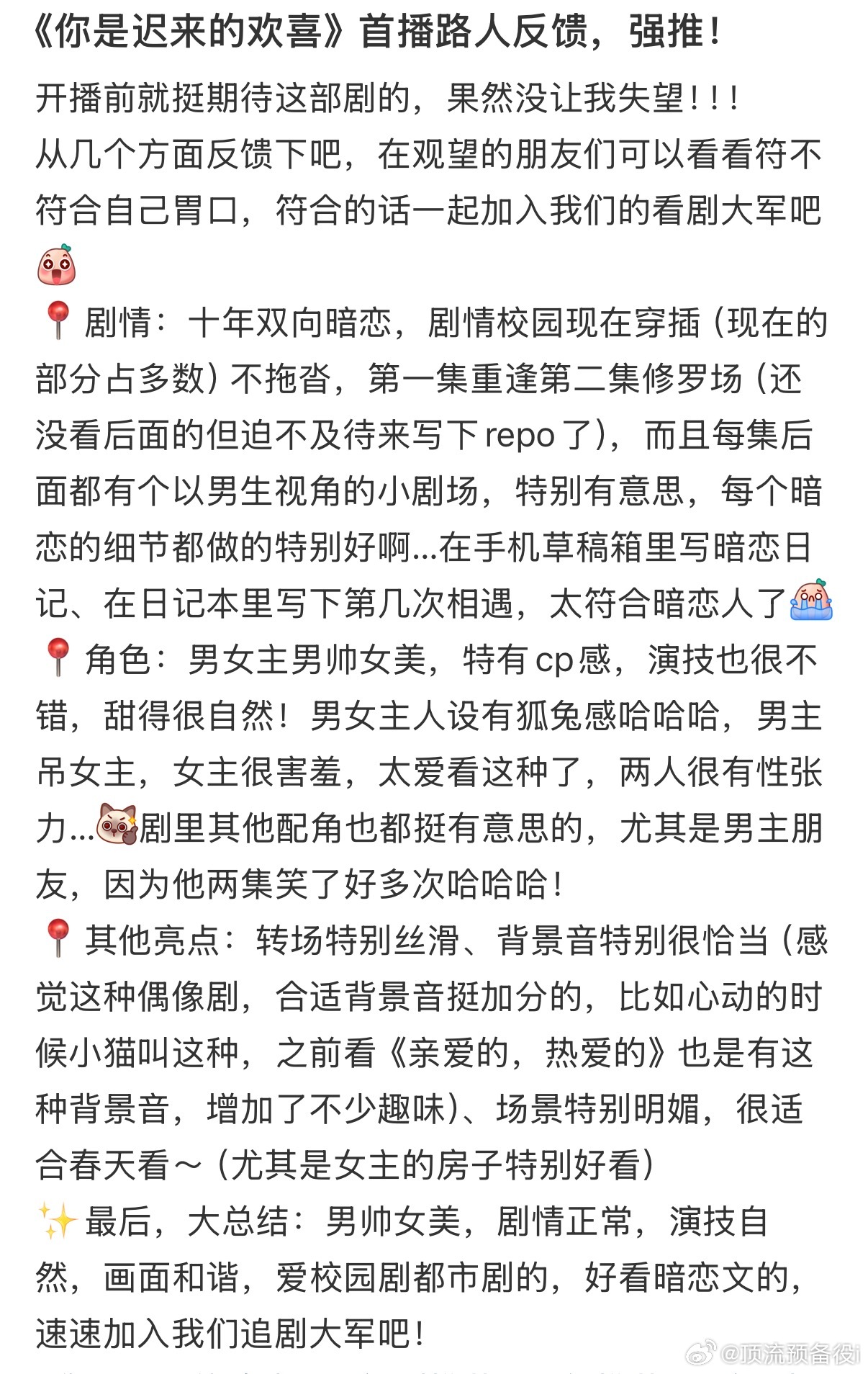 你是迟来的欢喜 我的评分:谁懂这个《你是迟来的欢喜》多曼妙!!!转场特别丝滑、背景音特别很恰当(感觉这种偶像剧,合适背景音挺加分的,比如心动的时候小猫叫这种)白敬亭郑合惠子互动 白敬亭宣传你是迟来的欢喜
