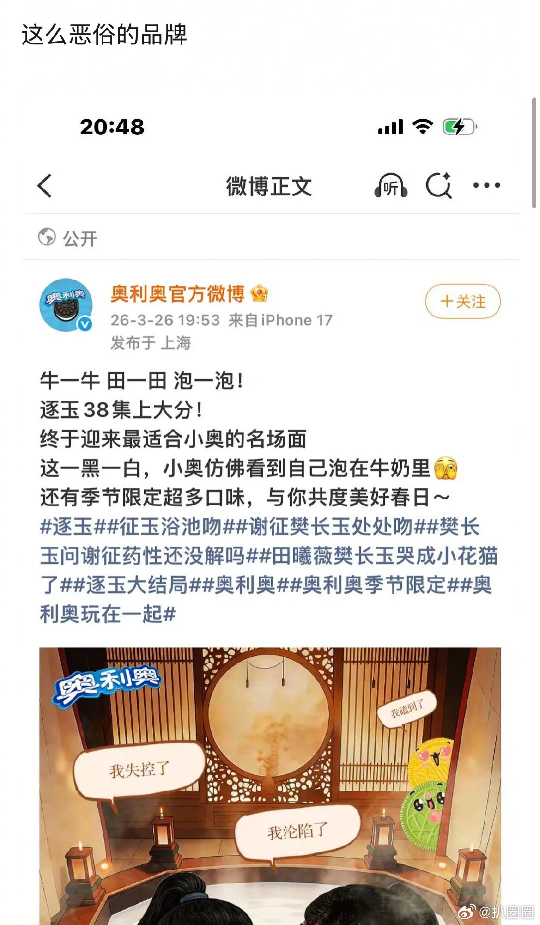 奥利奥发有关逐玉的宣传海报被热议,被指低俗…