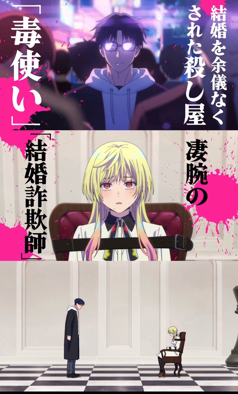 最期待的4月新番《婚姻毒素》异能战斗+恋爱喜剧动漫点评团海外动漫名场面新番 为了不让妹妹承担延续家族的痛苦使命,身为哥哥的下吕光挺身而出,然而母胎单身的他遭到众多相亲对象的吐槽,频频被拒~就在此时真爱降临,作为交换,帮我结婚吧!光与美人欺诈师城崎梅合作,邂逅最棒的婚姻!【CAST】下吕光:石谷春貴城崎梅:若山詩音姫川杏子:永瀬アンナ潮雫:伊瀬茉莉也嬉野シオリ:結川あさき鳴子弦弥:斉藤壮馬嵐山キミ恵:白浜灯奈乃中川桃壱:土屋神葉下呂アカリ:白石晴香花巻トシキ:祐仙勇