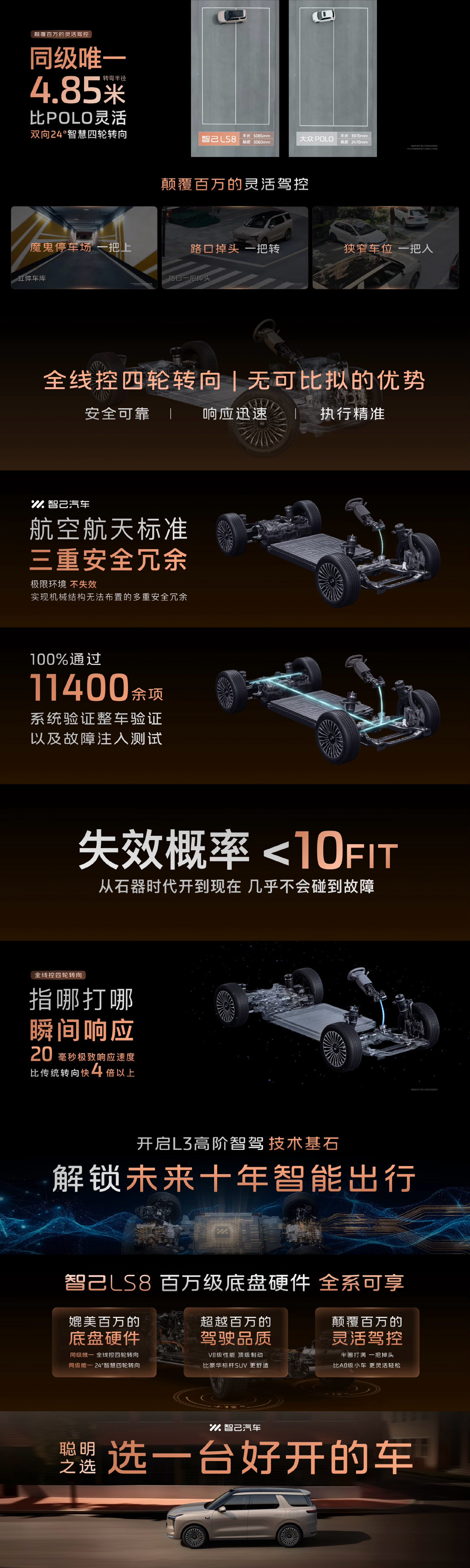 全系标配灵蜥数字底盘3.0,前双叉臂后多连杆+智能空悬,还有同级唯一双向24°四轮转向,5米大车转弯半径,比经典小两厢还小,魔鬼停车场一把入库、路口掉头一把过,彻底告别“大车难开”!底盘稳到高速过弯不侧倾、刹车不点头,带老人孩子出门也不晕车,爆胎稳定和主动防侧翻更是把安全感拉满!