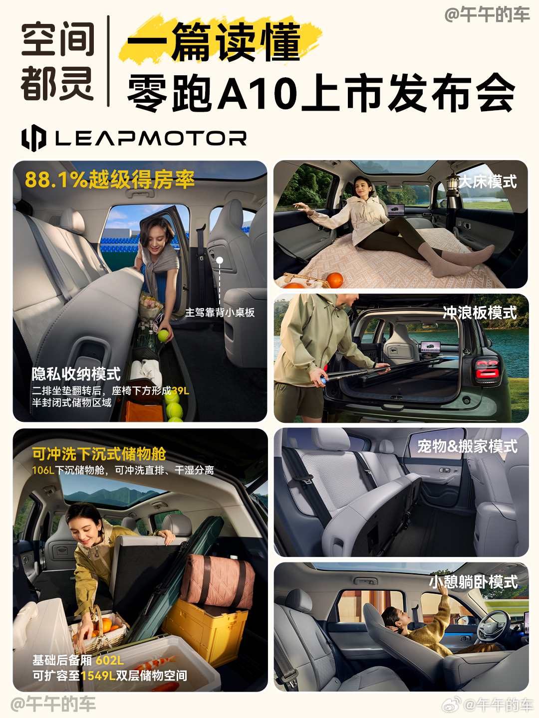 ❸空间凭借 CTC 电池底盘一体化技术与车身结构优化,实现88.1% 超高车内得房率,轻松适配家庭日常出行。基础后备厢 602L,座椅放倒后扩容至1549L双层储物空间,假期带足装备与家人好友出游,空间上也绰绰有余。额外配备106L可冲洗下沉式储物舱,座椅支持多种场景模式,二排坐垫上翻还能多出39L半封闭储物区,大件行李、零碎杂物一键收纳。