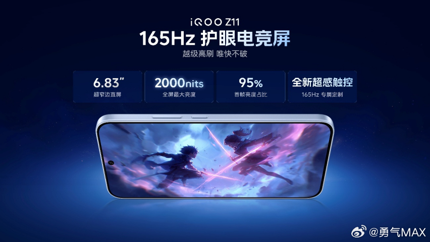 iQOO Z11 首发 165Hz 护眼电竞屏,搭配 9020mAh 超薄蓝海电池,天玑 8500 满血版跑分超 262 万,多款手游支持 165 帧高刷,屏幕护眼与游戏流畅度都拉满。90W 快充、IP68/IP69 防尘防水、7K 冰穹 VC 散热、OIS 主摄等配置齐全,机身轻薄握持舒服。