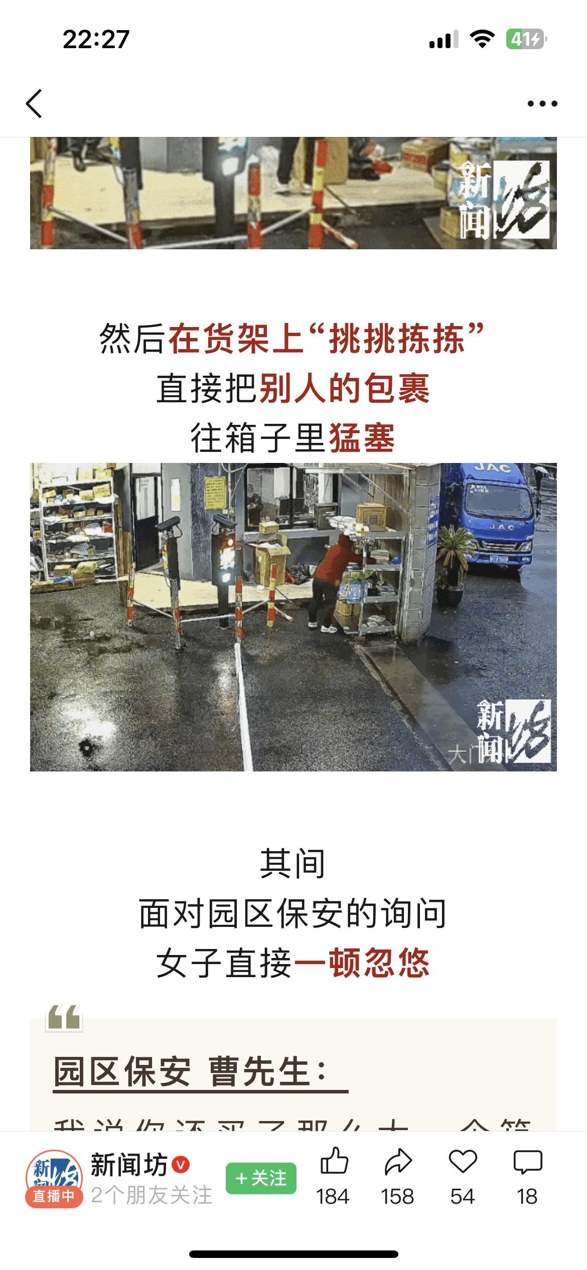 上海一女子偷 30 件快递寄回老家,在一快递站点被识破,报警被抓。事情发生于 3 月 18 日,上海彭越浦路一园区,女子黄某来到门口的快递站,直接拆开了一个行李箱,不紧不慢的找快递放到行李箱里,前前后后找了 30 个快递,旁边的保安很奇怪,询问女子是不是她的快递。女子说这是帮公司收的快递。 所有快递打包后,女子一个人拖不动,还找快递小哥借拖车,热心的快递小哥还帮忙打包装运。女子拖着这些快递快步来到另一处快递站点,准备把这些包裹发送回家给儿子用。 快递站点老板发现这些快递都完好无损,上面写的电话号码各式各样,起了疑心。悄悄的报警,警察赶过来抓住了黄某。发现她正是他们在调查的一起快递丢失案的主犯。这个女子真是愚蠢,到处都是摄像头,公然干这种偷鸡摸狗的事,怎么可能逃脱?