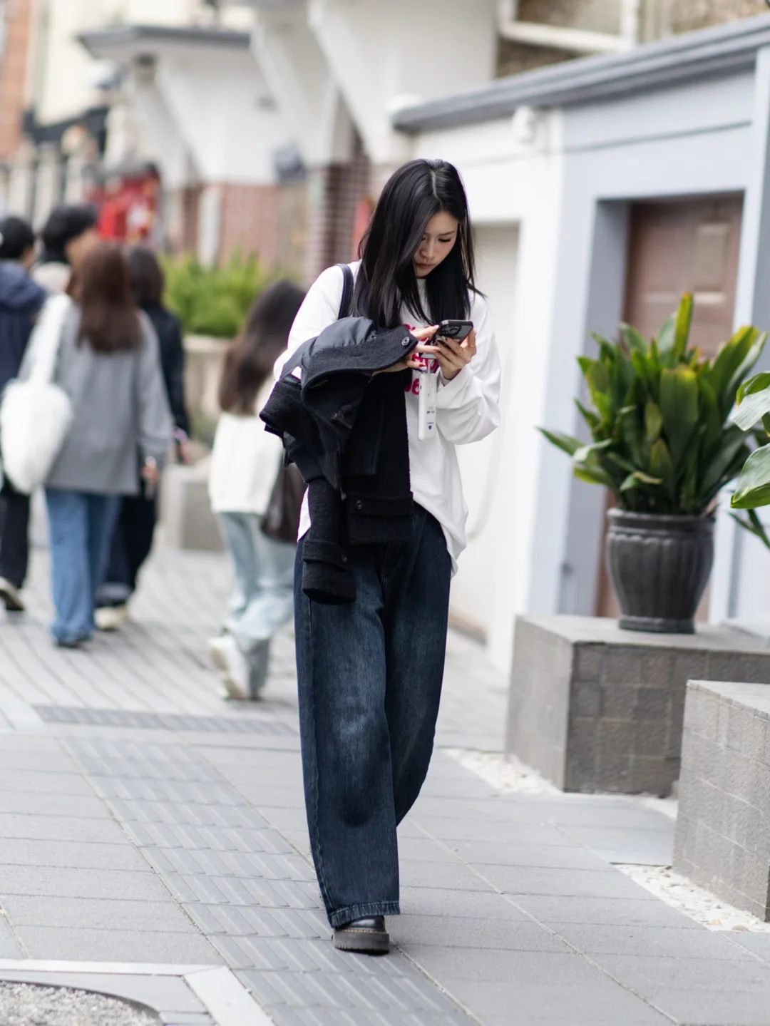 都市女孩的时尚穿搭,蓝色牛仔裤搭配黑色皮靴,手提小包,自信走在街头。