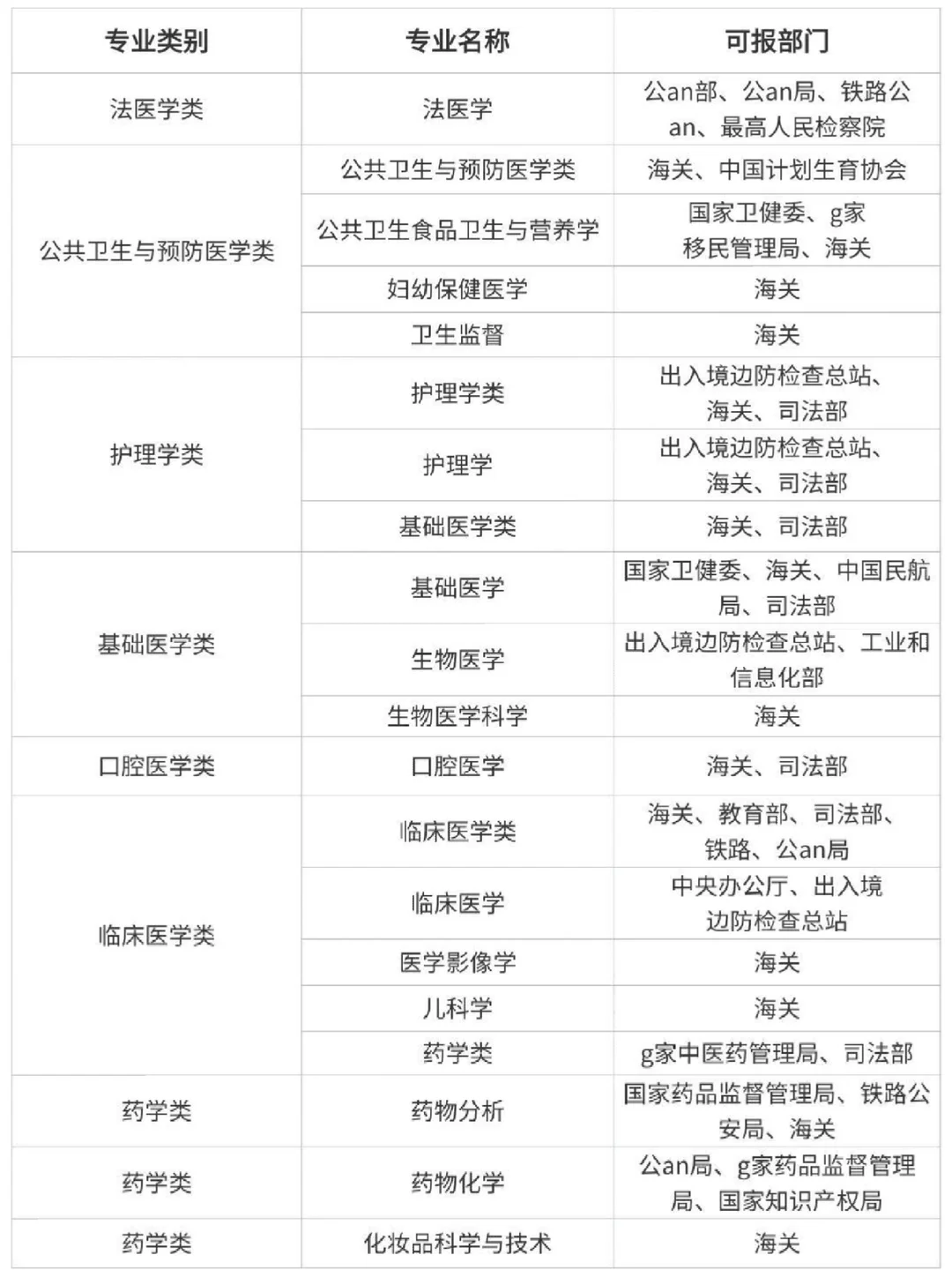 法医学类、公共卫生与预防医学类、护理学类、基础医学类、口腔医学类、临床医学类、药学类、医学技术类、中西医结合类、中药学类、中医学类等