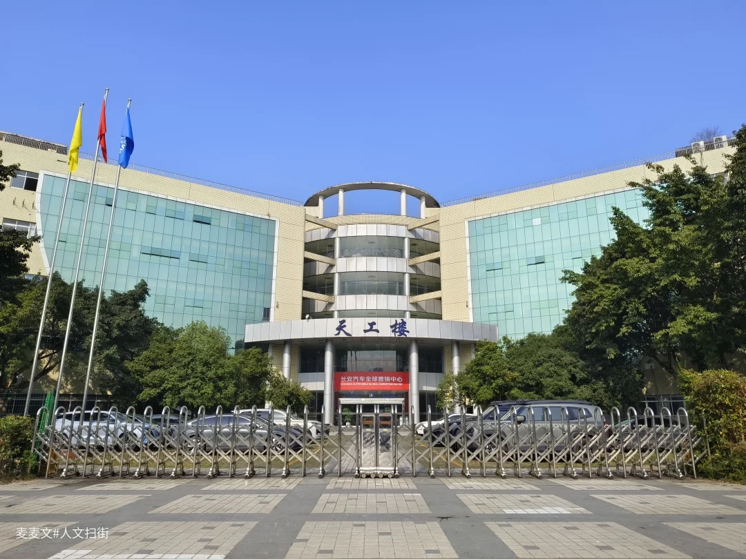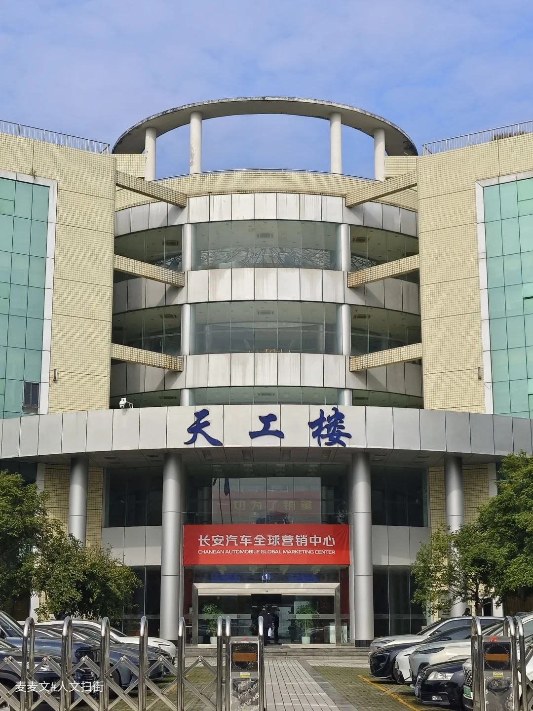 天工楼以米黄石材搭配大面积绿玻,中间弧形中庭层层递进,顶部环形廊架如科技光环,沉稳又充满未来感。“天工楼”三字遒劲,门口停满深蓝、阿维塔等新能源车型,直观展现长安全球化的底气。