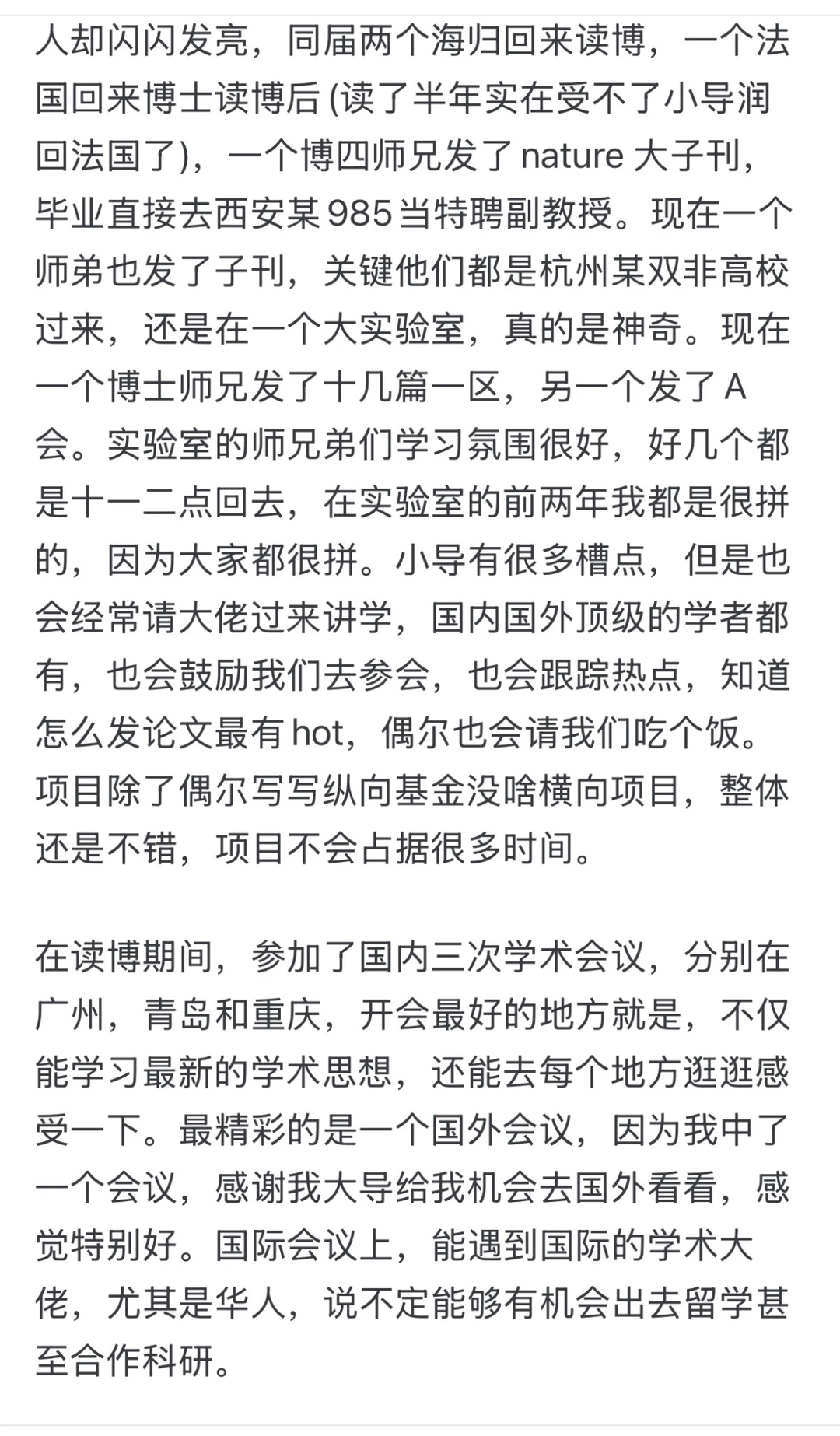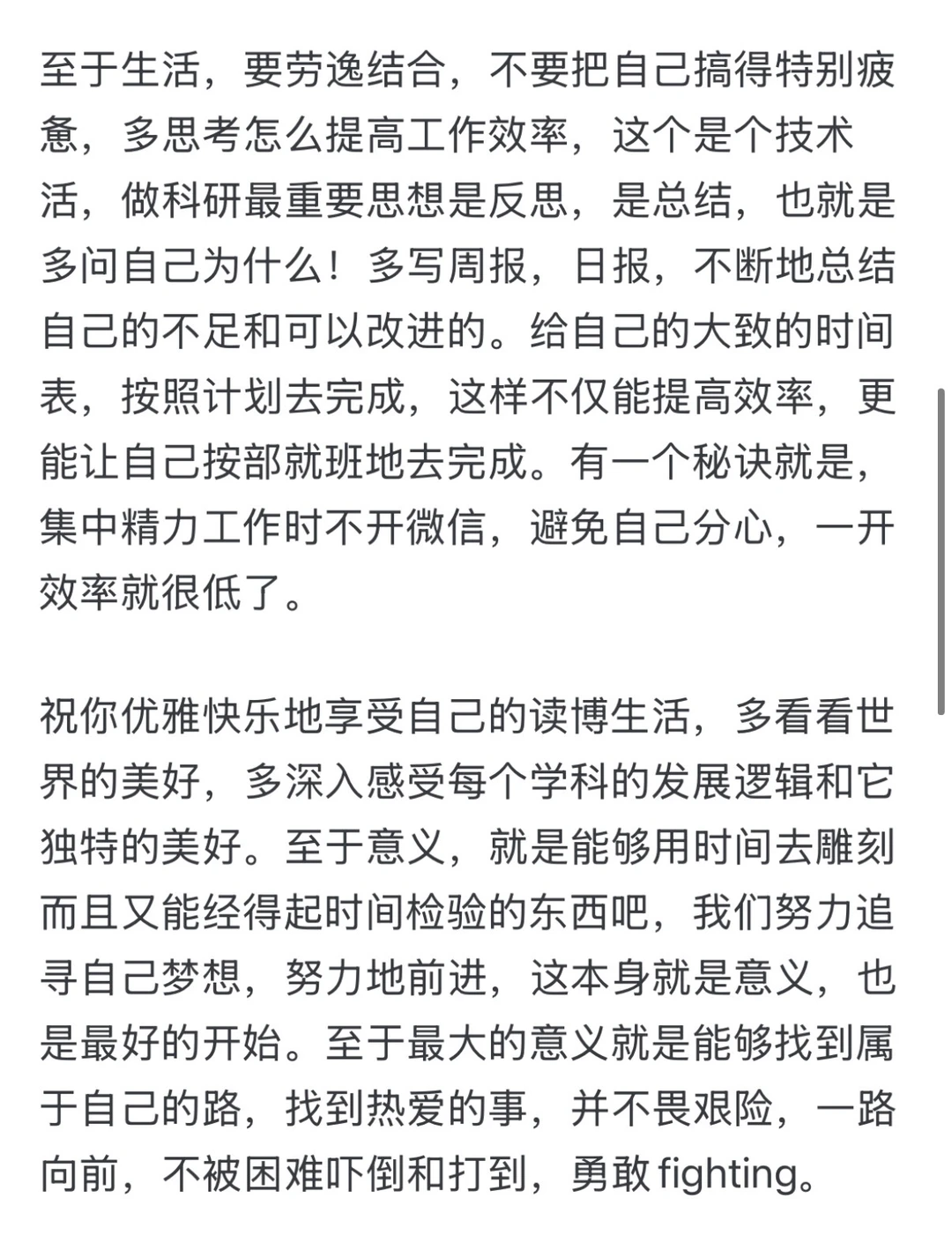 至于生活,要劳逸结合,不要把自己搞得特别疲惫,多思考怎么提高工作效率,这个是个技术活,做科研最重要思想是反思,是总结,也就是多问自己为什么!多写周报,日报,不断地总结自己的不足和可以改进的。给自己的大致的时间表,按照计划去完成,这样不仅能提高效率,更能让自己按部就班地去完成。有一个秘诀就是,集中精力工作时不开微信,避免自己分心,一开效率就很低了。