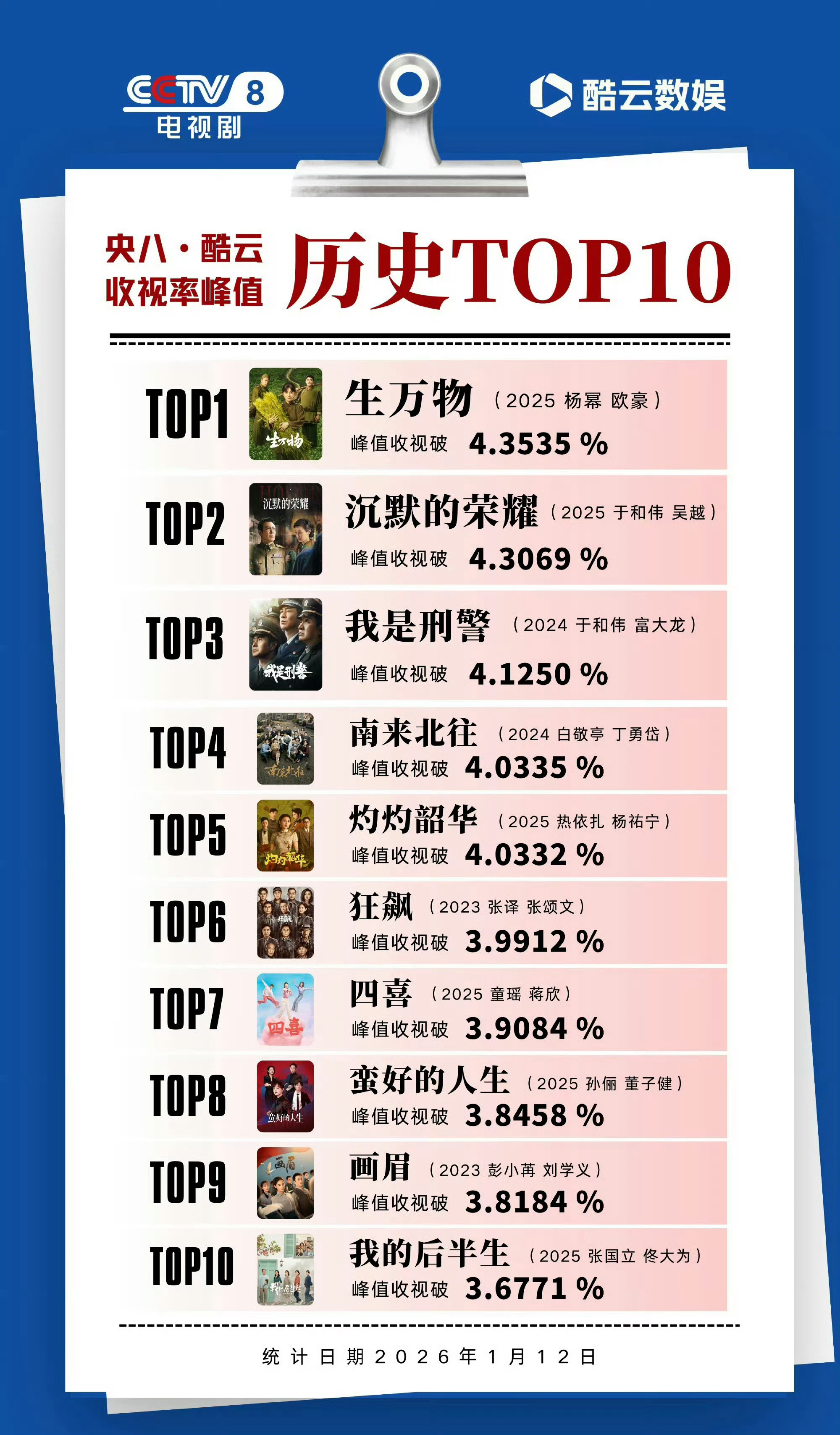 央八酷云实时收视峰值历史排名杨幂《生万物》太优秀了,依然是酷云峰值史冠,三集连播